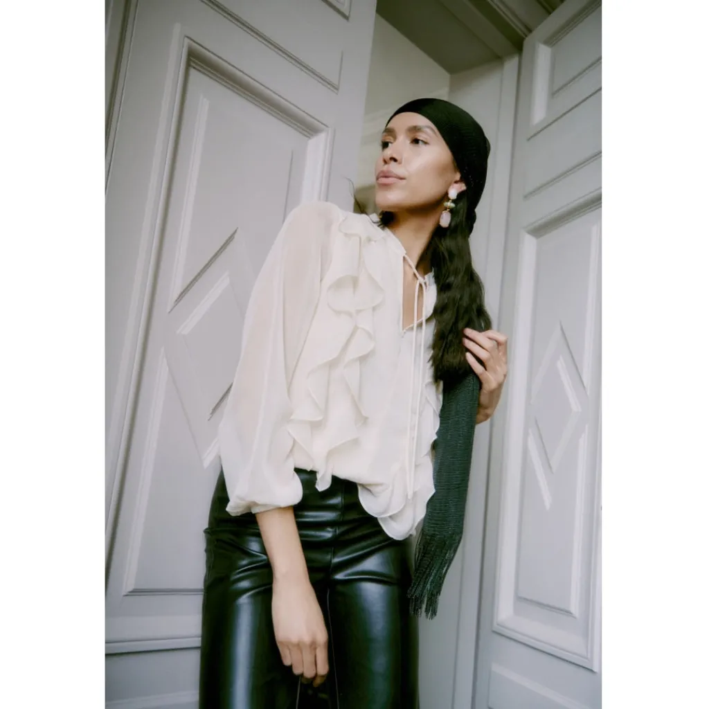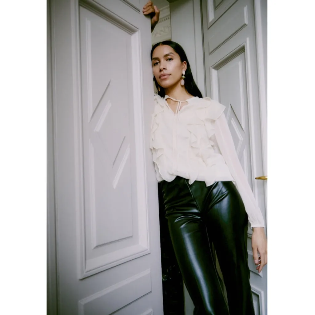 Flot og feminin bluse fra B.Young med flæsedetaljer foran. Blusen har en binde detalje ved hals, samt elastikkant ved ærme. Den passer helt perfekt en et par bukser og en stilet for et sofistikeret look.