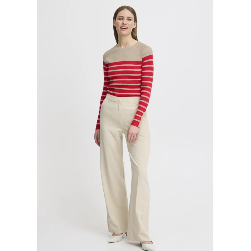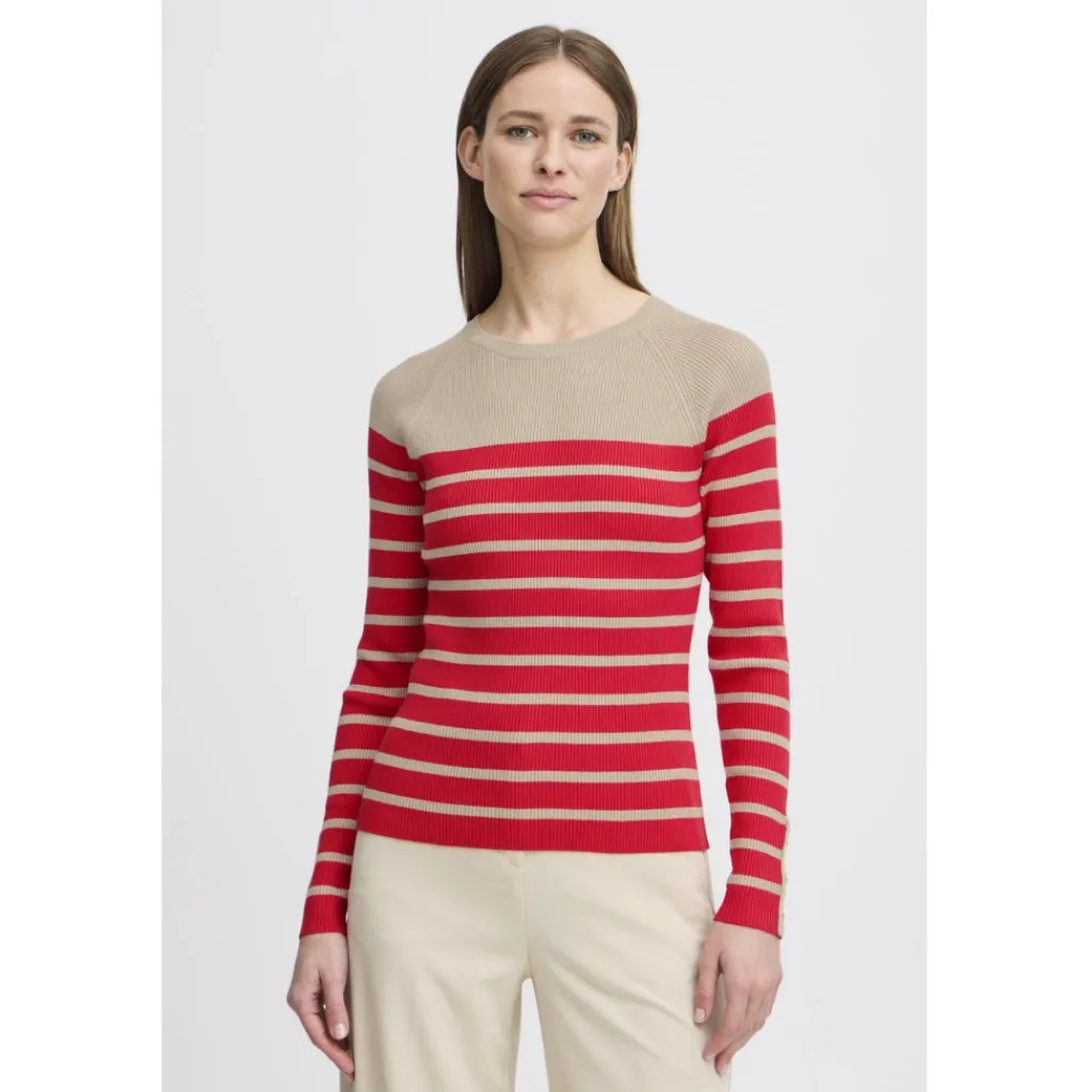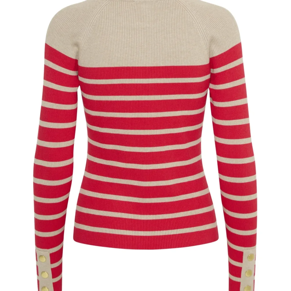 Sød stribet strik med fine knapdetaljer på ærmerne. Komfortabel og stilfuld, perfekt til et casual look.