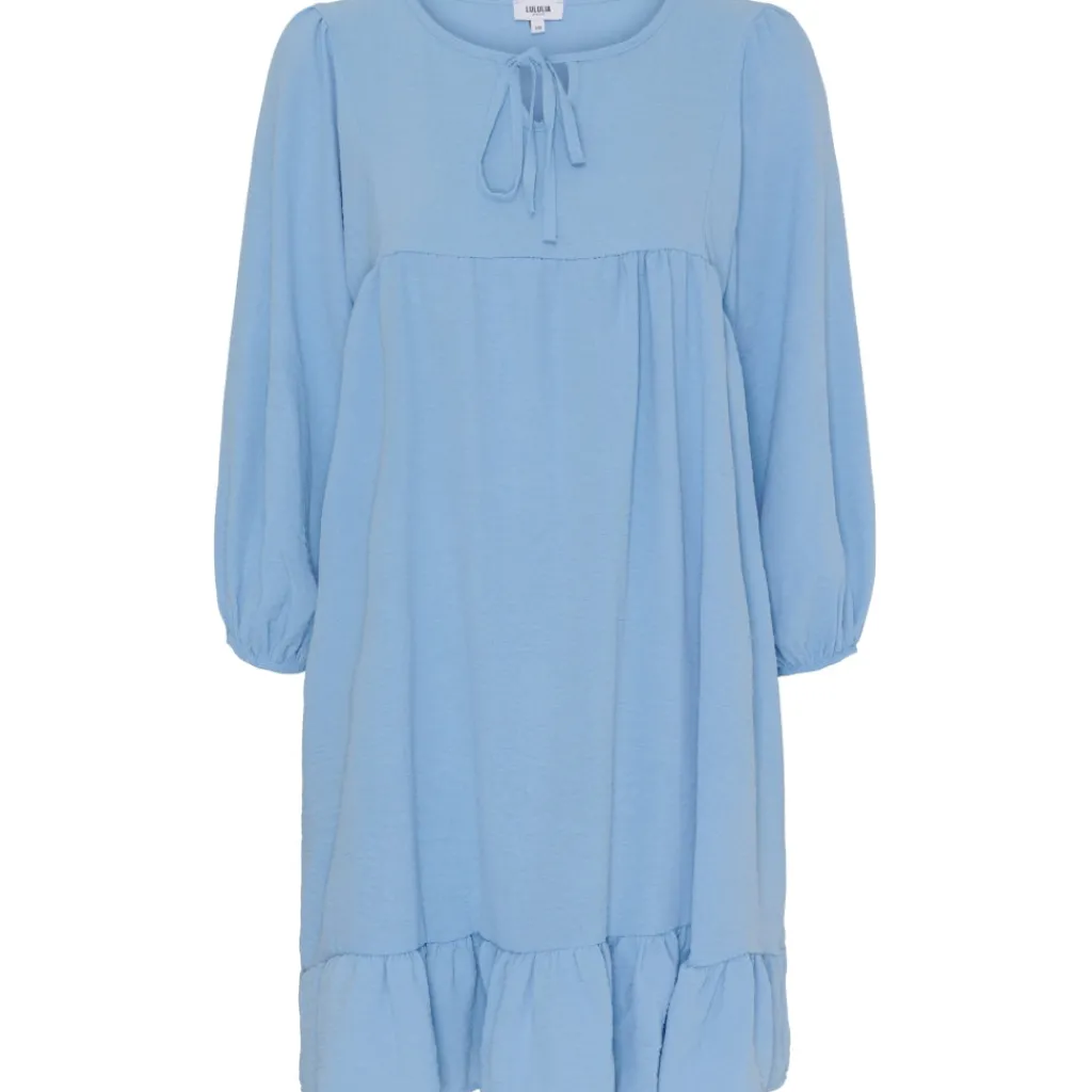 Elegant kjole med et fint bindebånds detalje ved kraven. Kjolen er oplagt at bruge til både hverdag og fest.