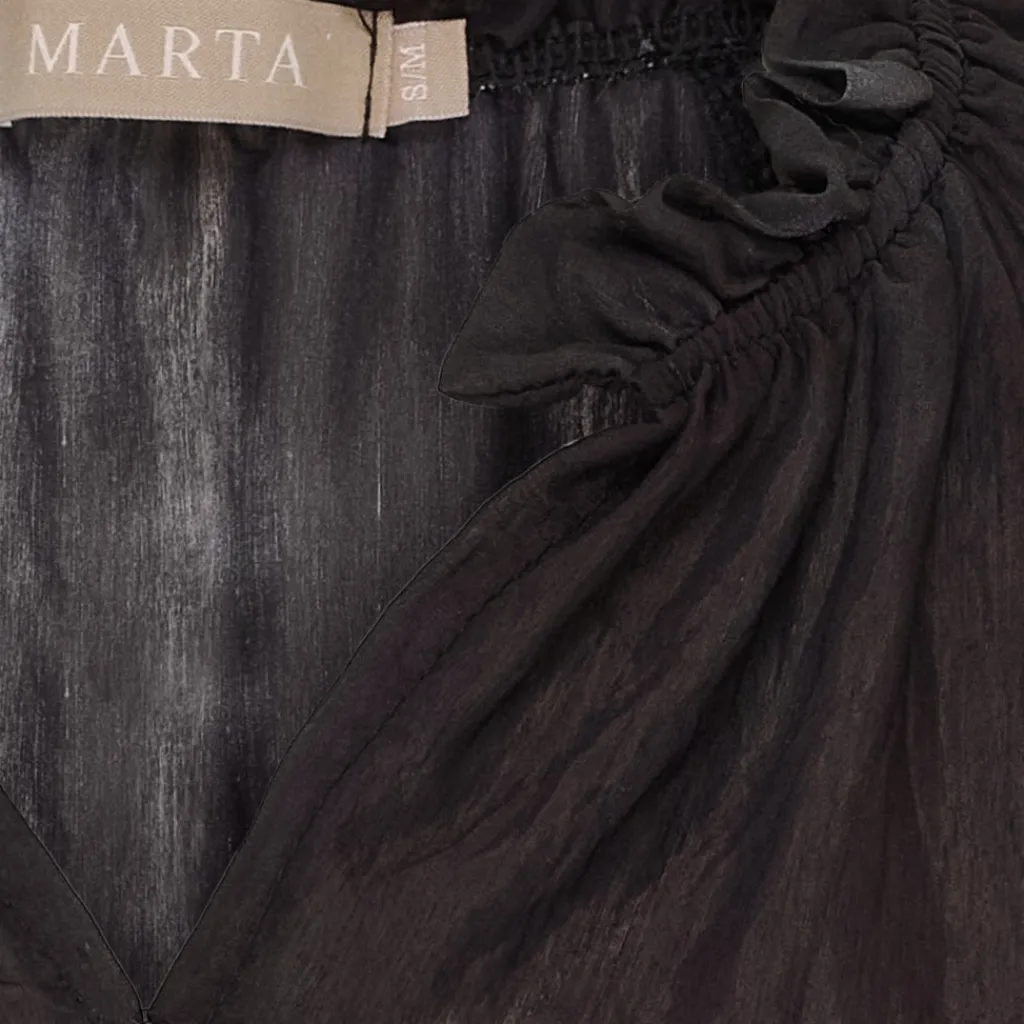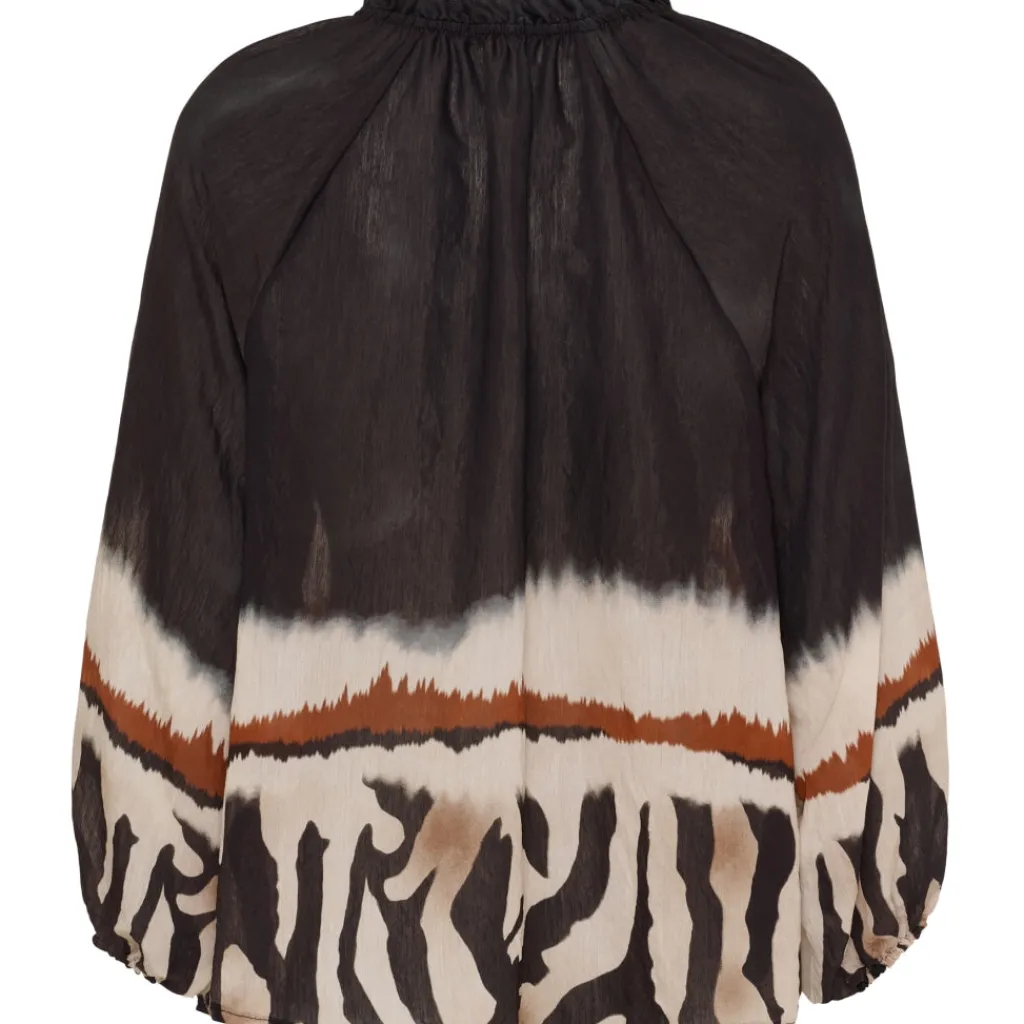 Sød bluse fra Marta du Château i et flot print. Blusen er V-halset med flæse detalje og lidt længere bagtil end foran. Den kan styles med både jeans og sneakers for et hverdags outfit, eller en nederdel og ballerina til finere brug.