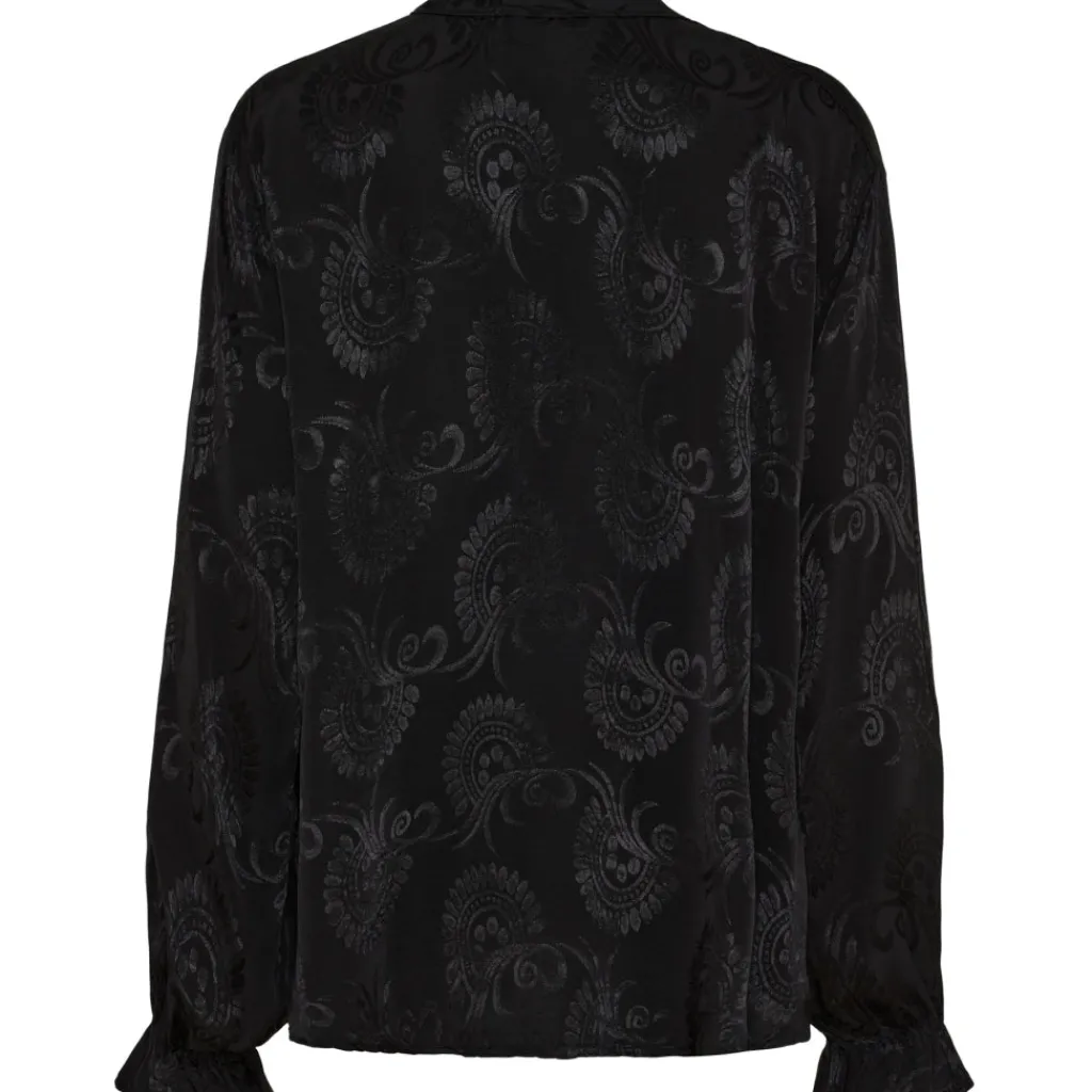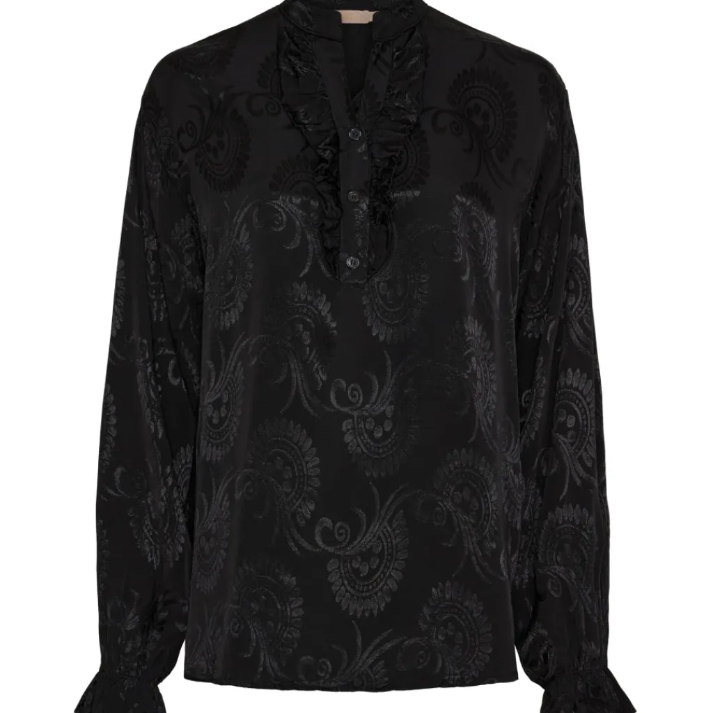 Smuk bluse fra Marta med flæser og et elegant print. Blusen kan styles med matchende bukser, og kan både bruges til hverdag og finere brug.
