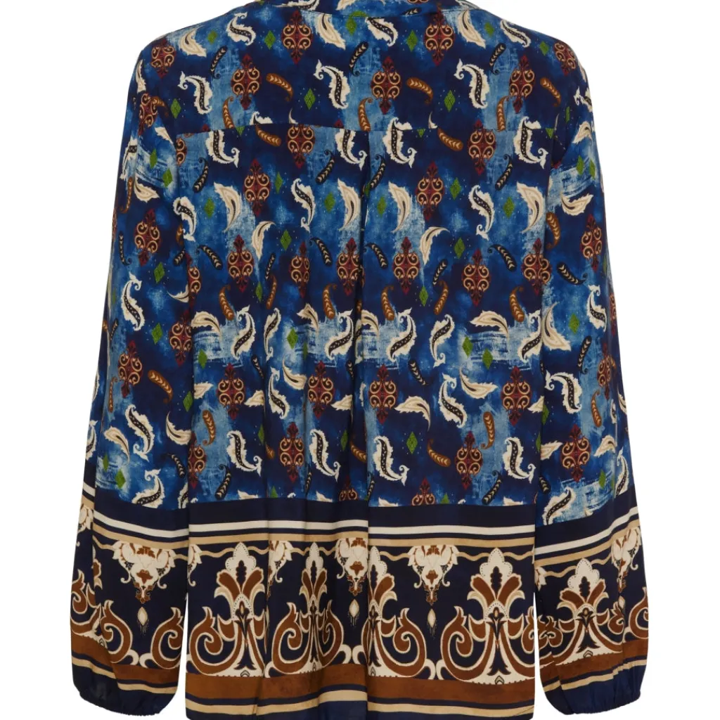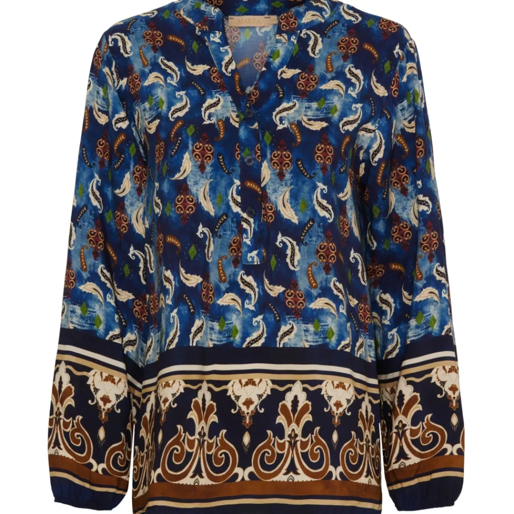 Smuk bluse med feminint mønster fra Marta. Blusen er v-halset og har sofistikerede knapper, og kan både bruges til hverdag og finere anledninger.