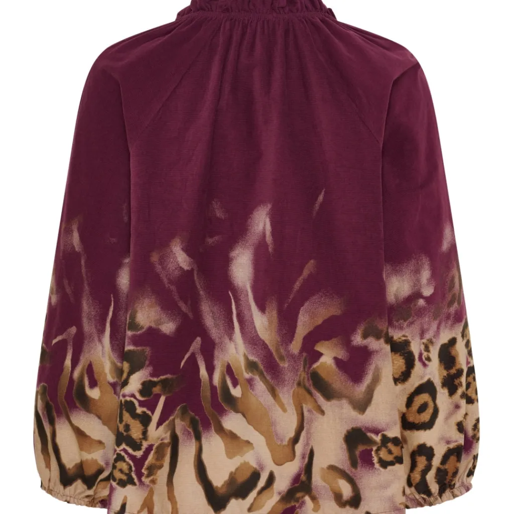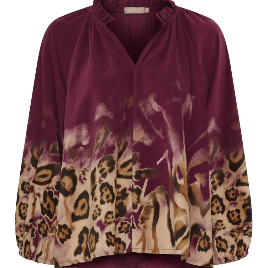 Sød bluse fra Marta du Château i et flot print. Blusen er V-halset med flæse detalje og lidt længere bagtil end foran. Den kan styles med både jeans og sneakers for et hverdags outfit, eller en nederdel og ballerina til finere brug.