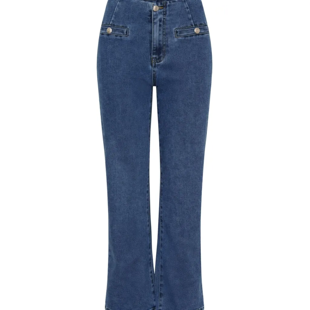 Seje jeans med brede bukseben fra Marta. Jeansene har fede detaljer og er normale i størrelsen.