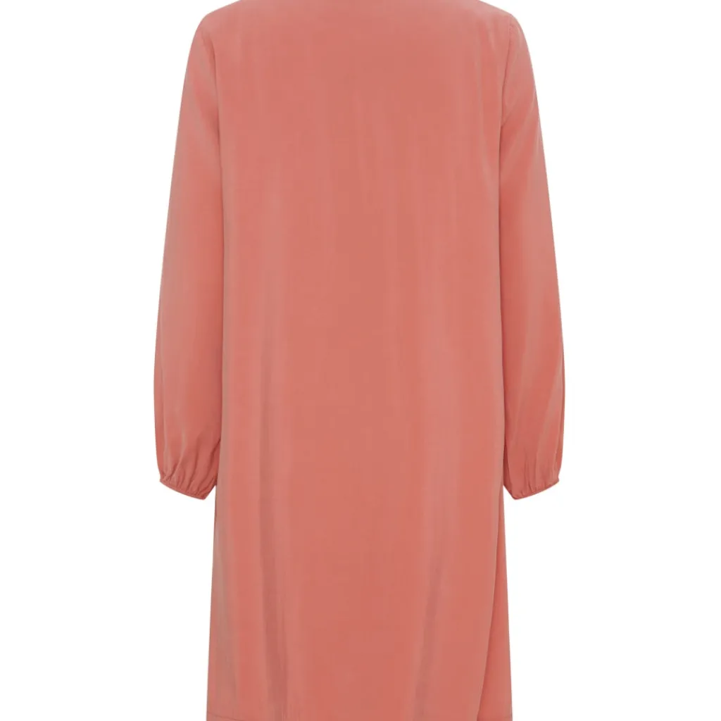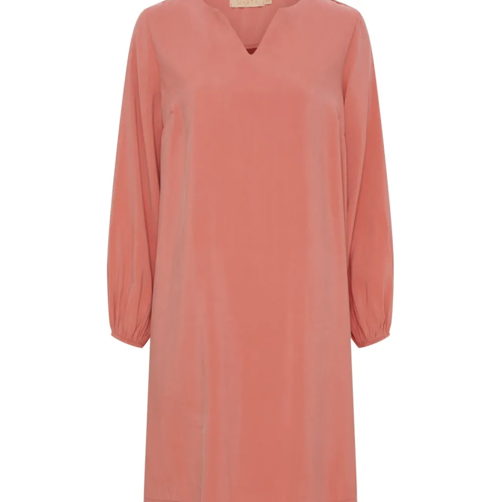 Fin, enkel kjole med en flot V-hals og lange ærmer med elastikdetaljer. Den løse pasform gør den super behagelig at have på, og den er perfekt til forskellige anledninger.