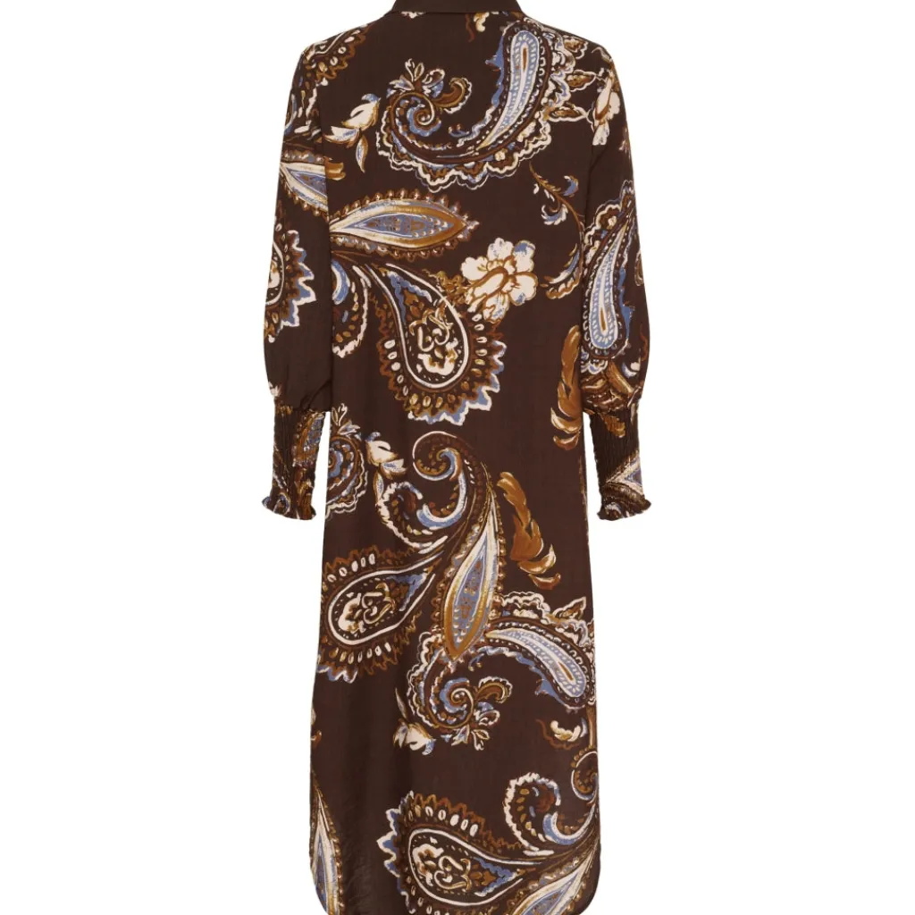 Smuk og elegant printet kjole fra Marta Du Château. Kjolen er gennemknappet, har krave og smock ved ærmer. Kan bruges til både hverdag og finere brug.