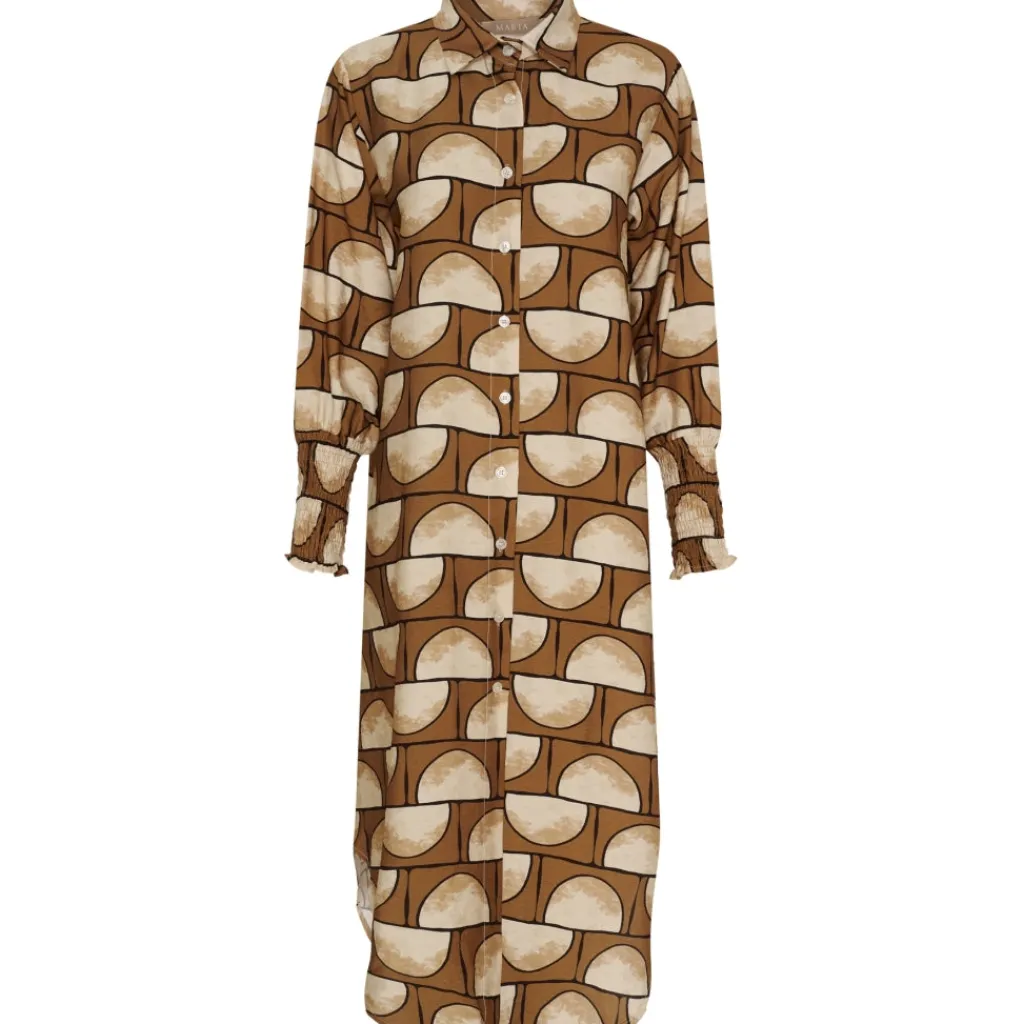 Smuk og elegant printet kjole fra Marta Du Château. Kjolen er gennemknappet, har krave og smock ved ærmer. Kan bruges til både hverdag og finere brug.