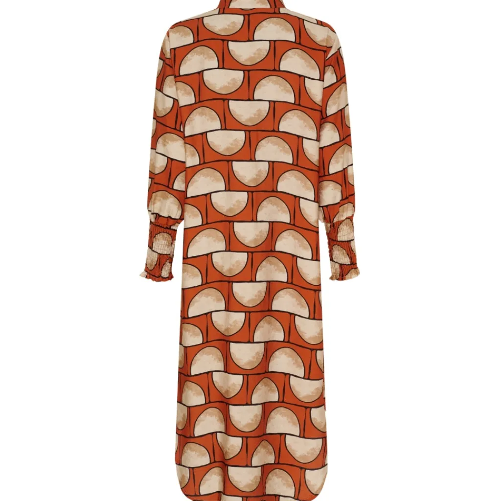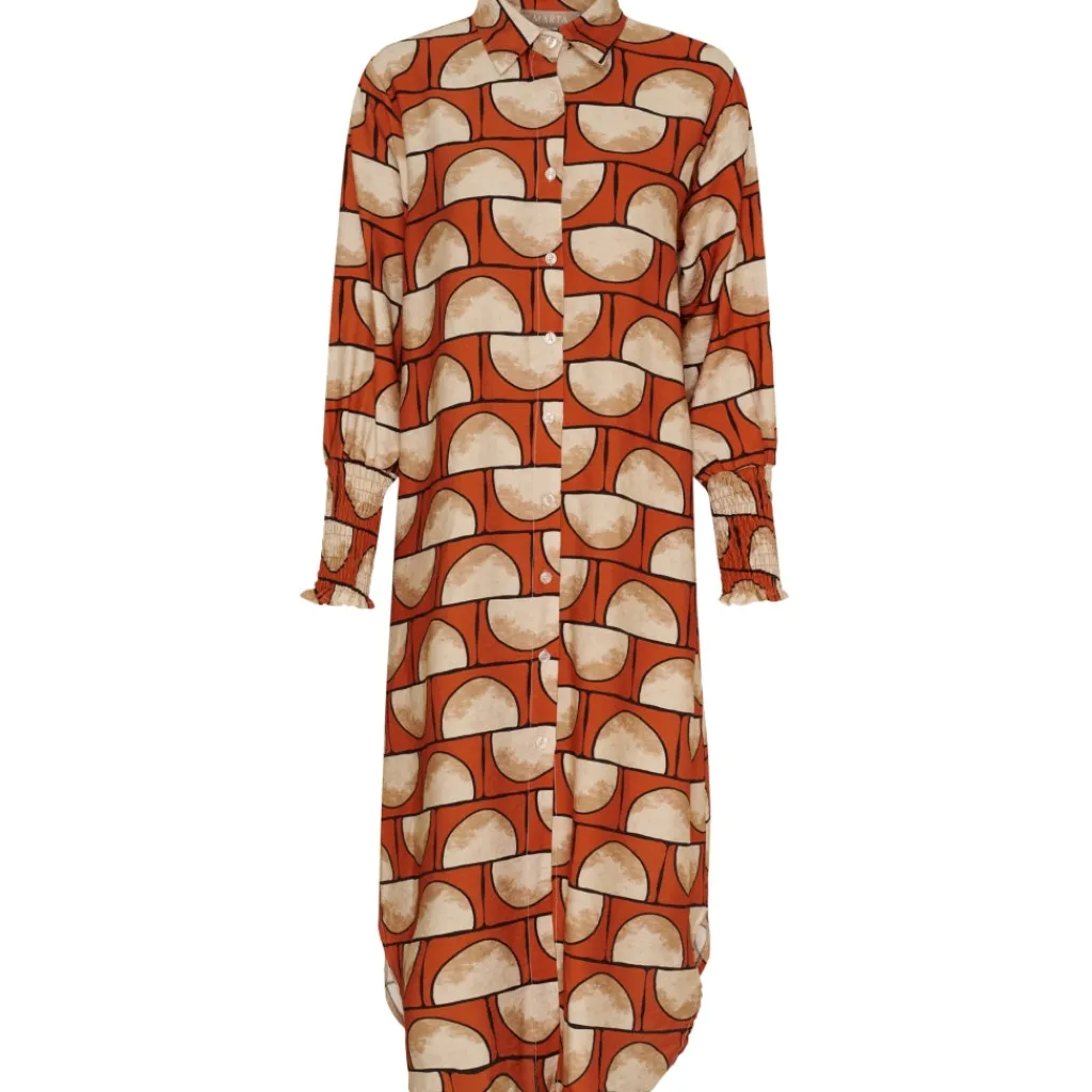 Smuk og elegant printet kjole fra Marta Du Château. Kjolen er gennemknappet, har krave og smock ved ærmer. Kan bruges til både hverdag og finere brug.