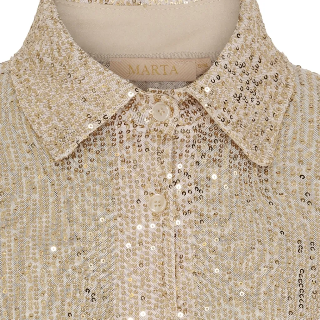 Smuk glimmerskjorte med sofistikerede knapper langs fronten. Skjorten er ideel til festlige begivenheder, evt. med en nederdel og et par stiletter.