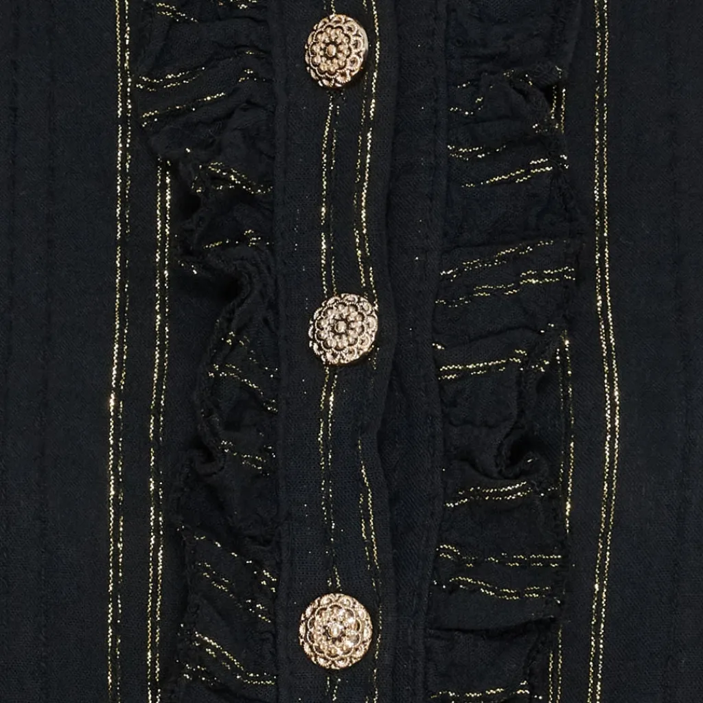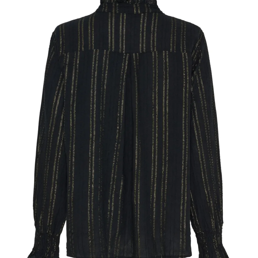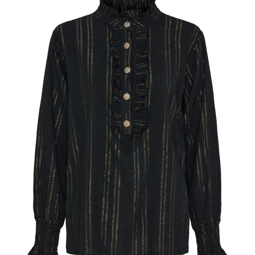 Smuk bluse med flæser, glimmer og elegante knapper. Blusen har en høj, feminin krave som tilfører et ekstra touch til dit outfit.