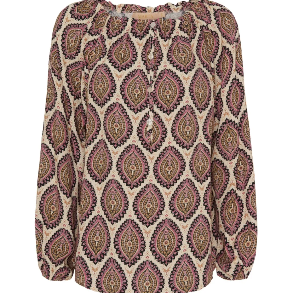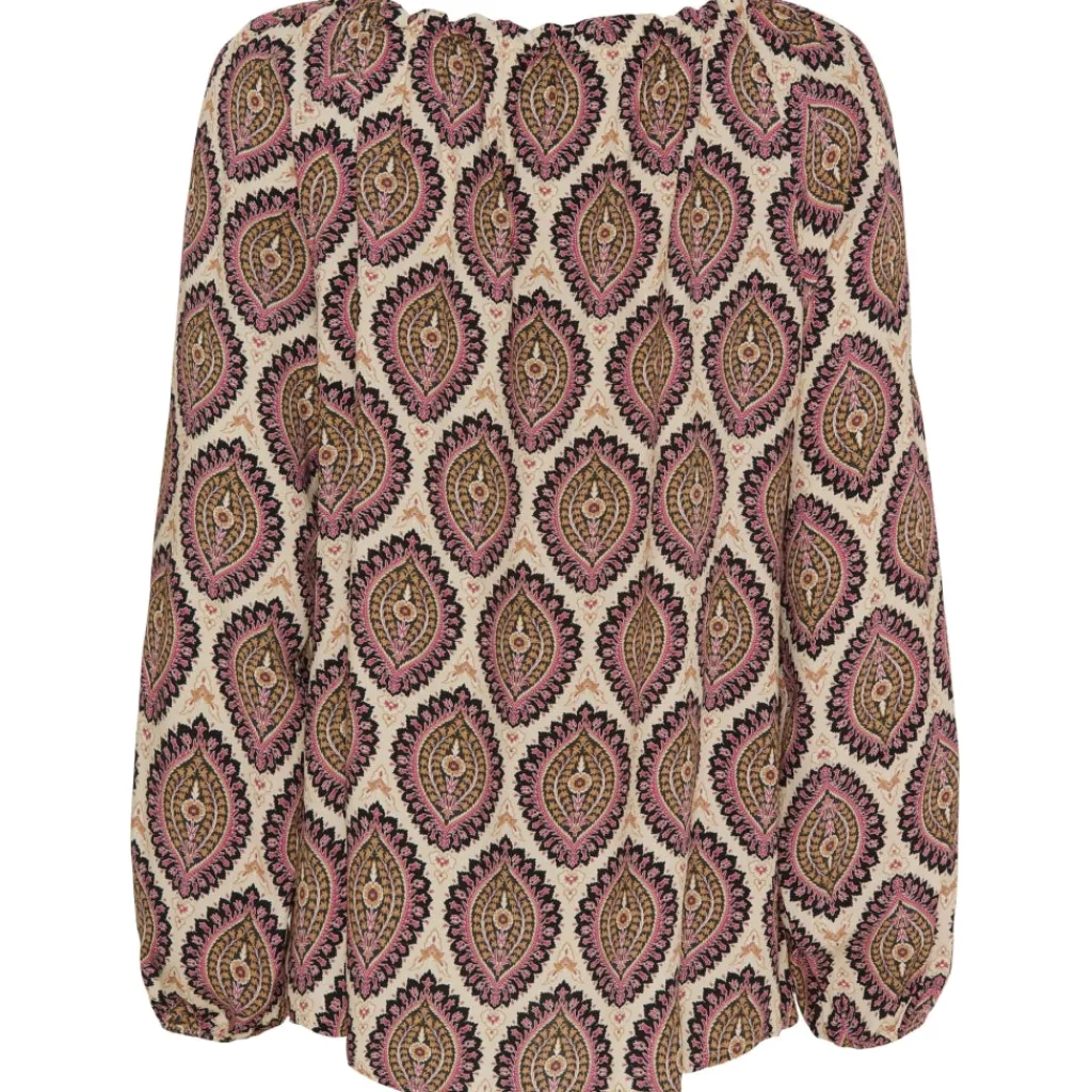 Fin bluse med elegant mønster fra Marta Du Cháteau. Blusen har diskrete knapper foran og elastik i halsen, så den også kan bruges off-shoulder. (Det kan have lidt betydning for brystmålet)