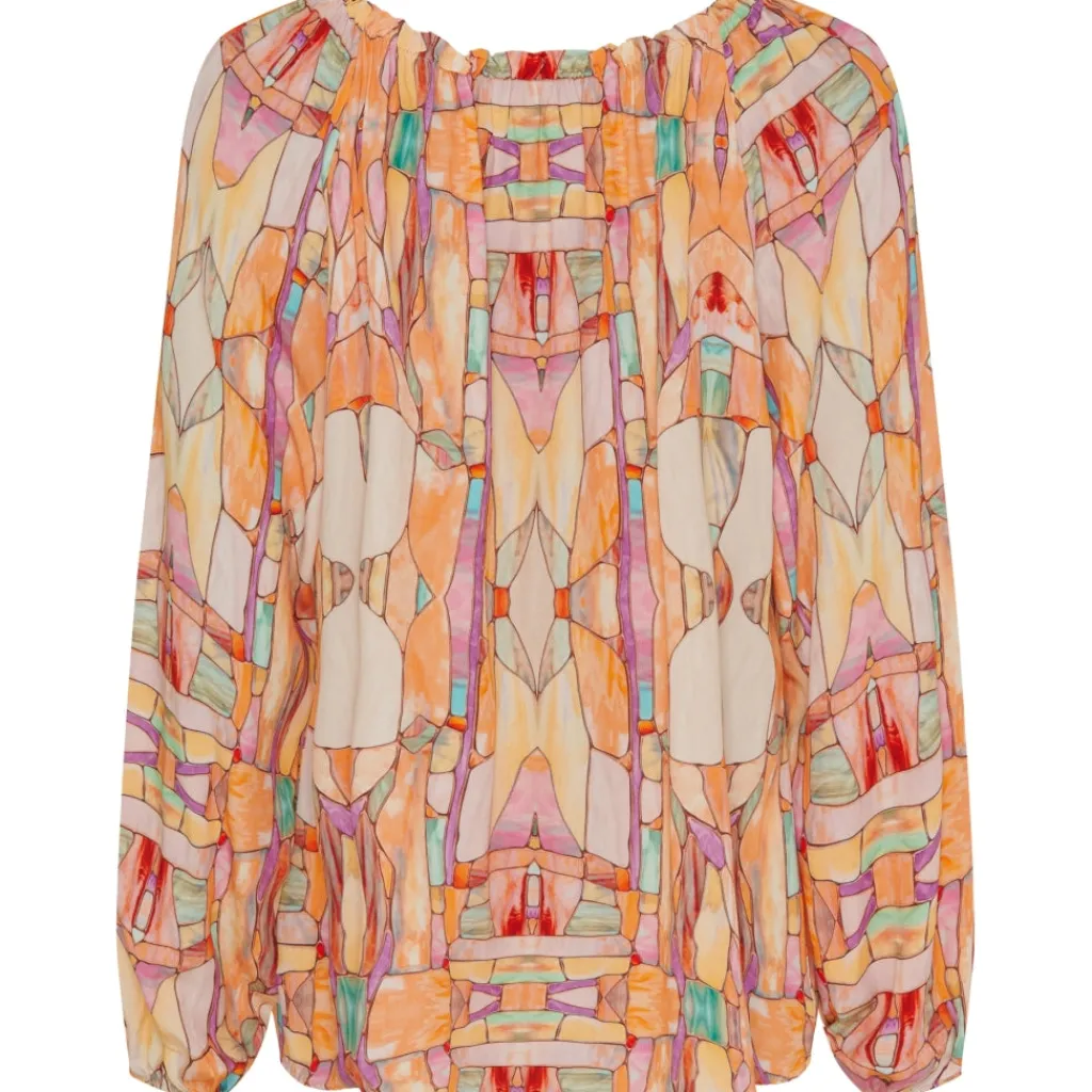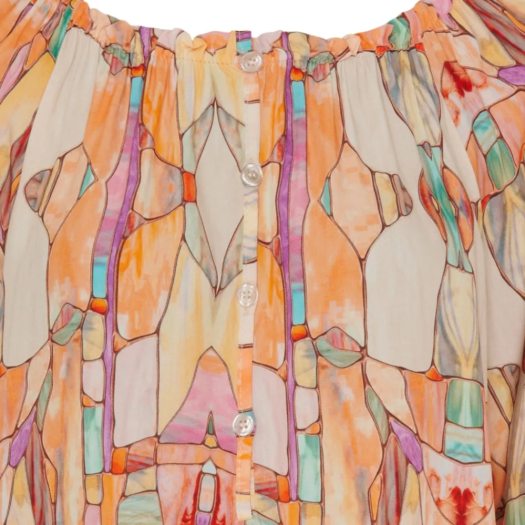 Fin bluse med elegant mønster fra Marta Du Cháteau. Blusen har diskrete knapper foran og elastik i halsen, så den også kan bruges off-shoulder. (Det kan have lidt betydning for brystmålet)
