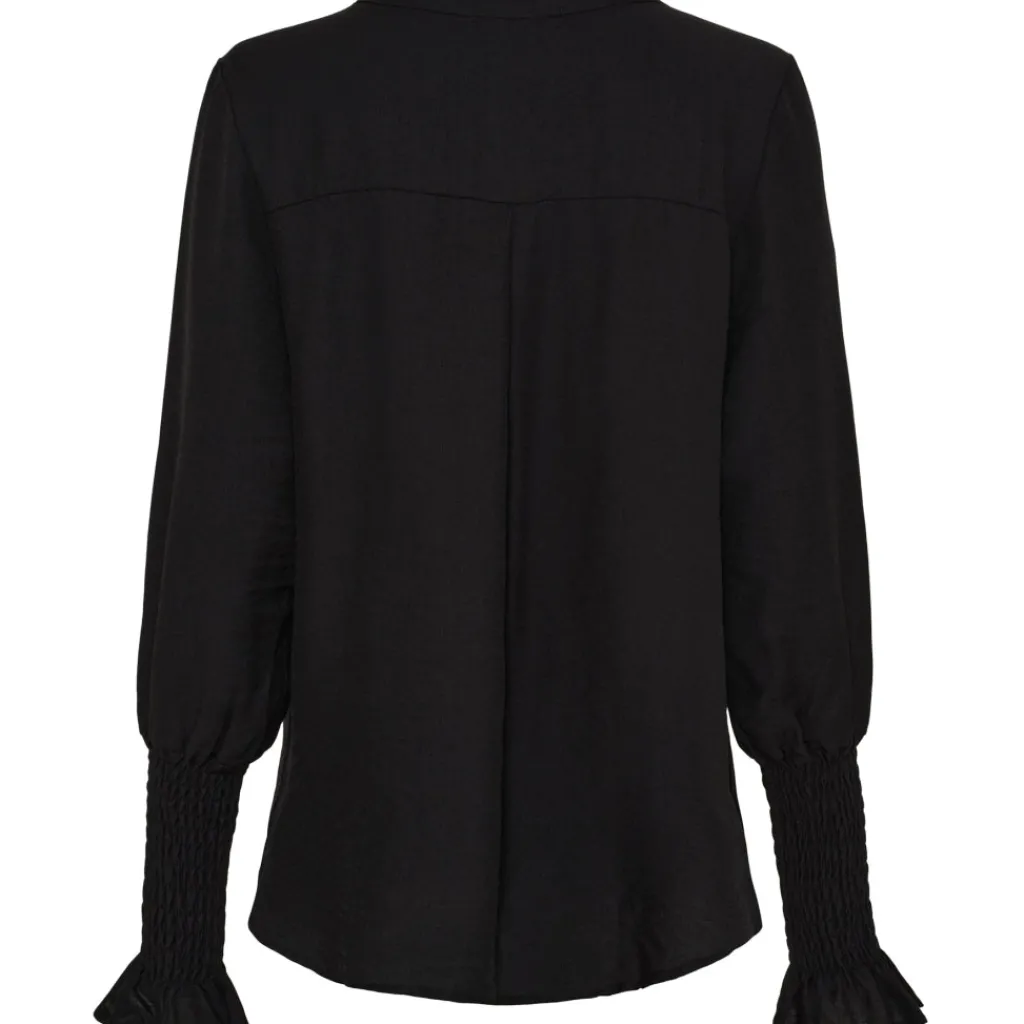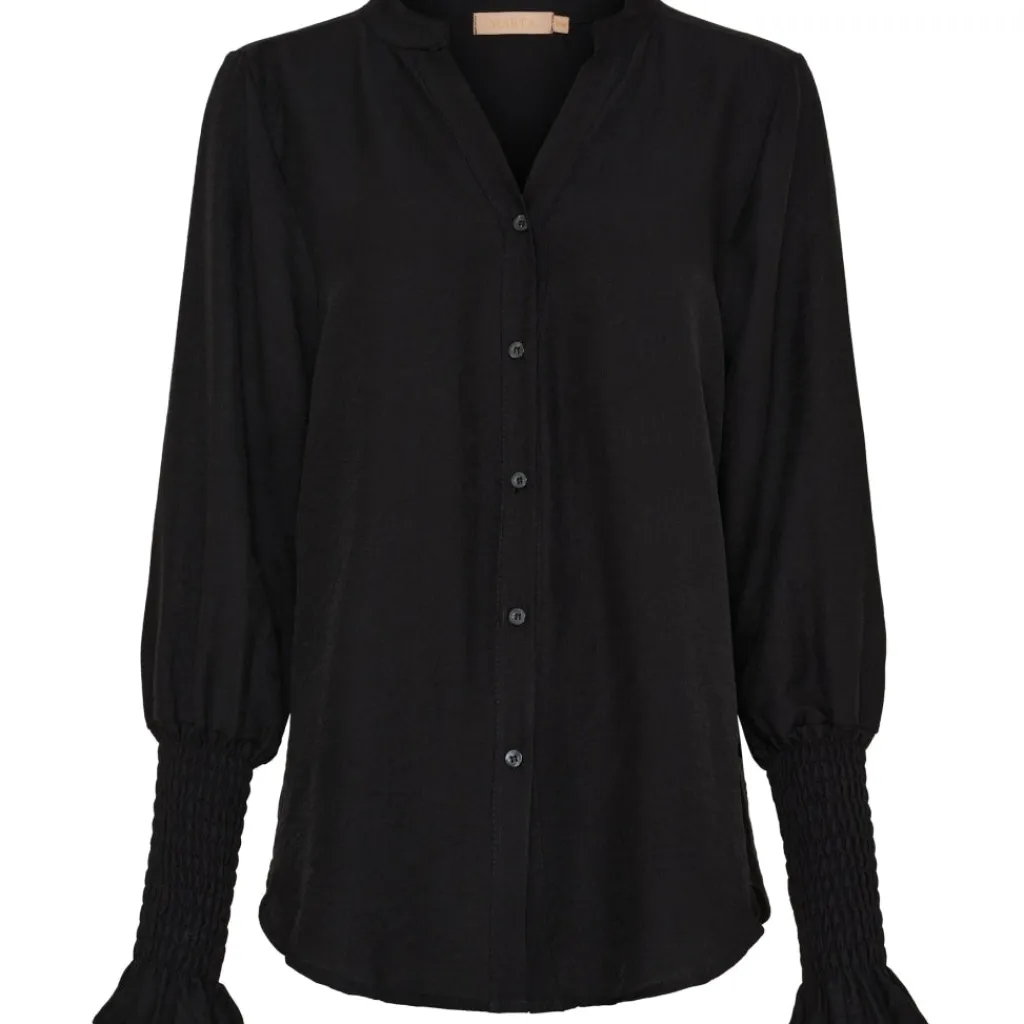 Smuk v-halset skjorte med smock ved ærmerne. Skjorten har knapper langs fronten og er super feminin. Kan styles til et par jeans og sneakers.