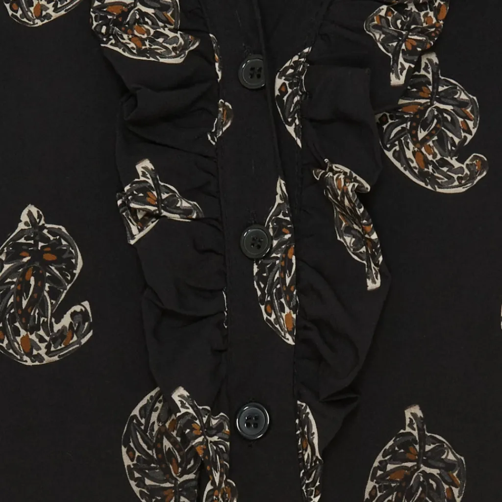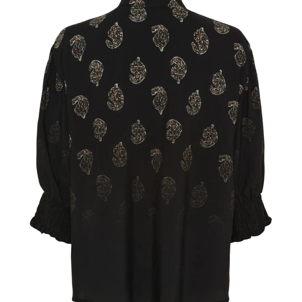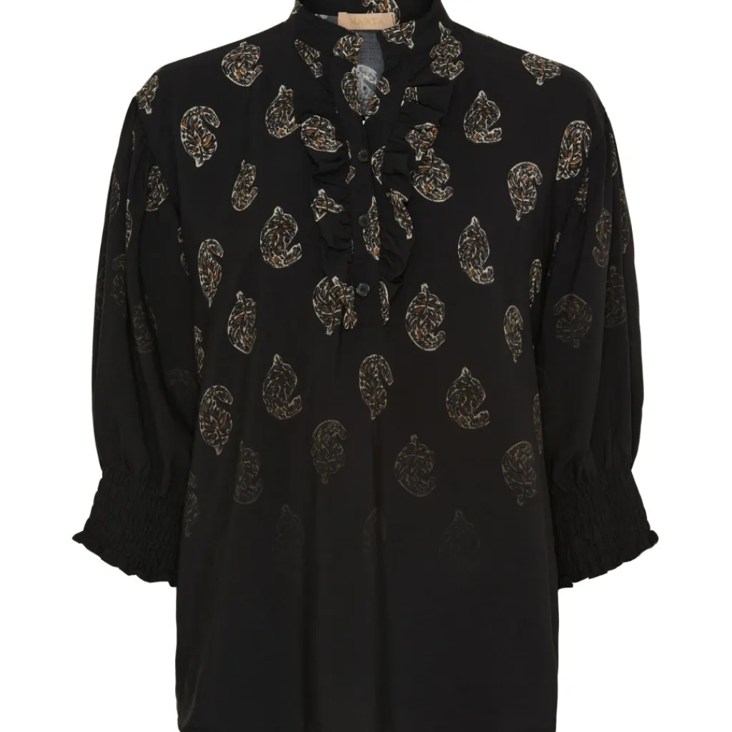 Fin bluse med flæser og smock ved ærmerne. Ideel til hverdag med et par jeans og sneakers til.