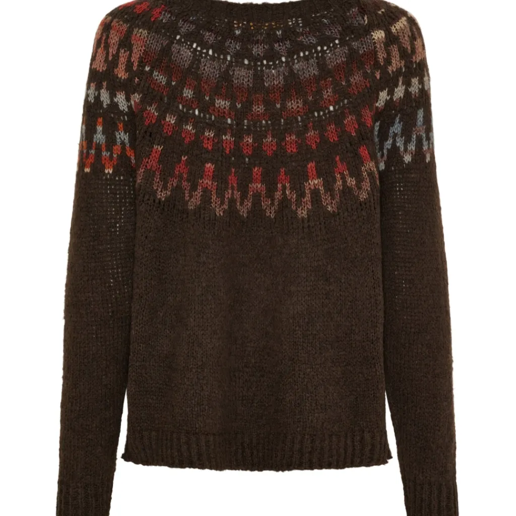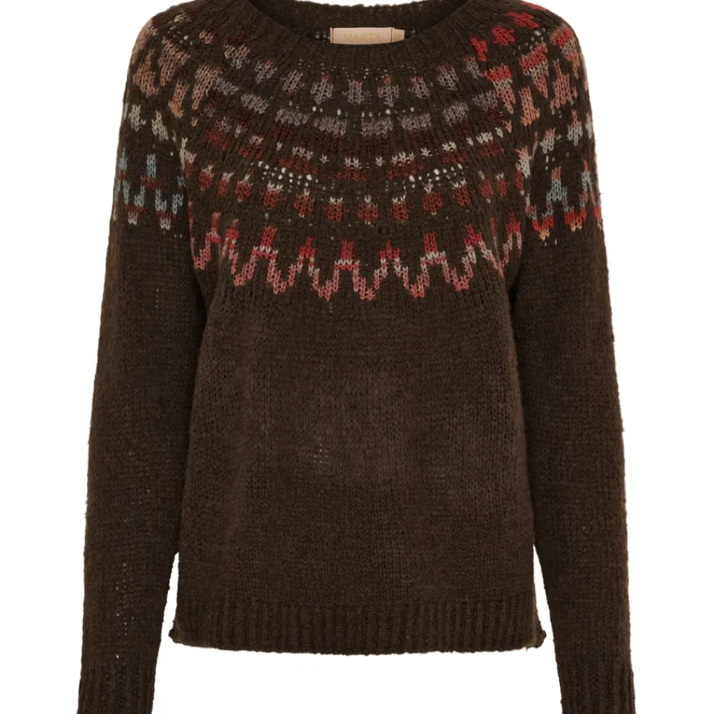 Lækker striktrøje fra Marta du Château med flot print. Den har rund hals, ribkant ved ærme, hals og nederst. Strikken er perfekt til hverdag, stylet med et par jeans og chunky støvler.