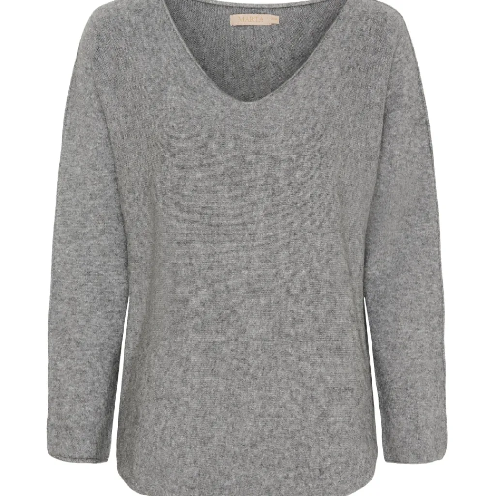Dejlig blød striktrøje med v-hals. Strikken er super komfortabel og kan både bruges for sig selv eller med en blondetop under for en fin detalje ved halsen.