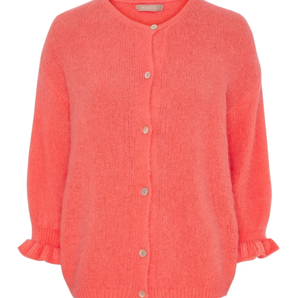 Sød strikket cardigan fra Marta med flæsedetaljer ved ærme. Cardiganen har fine knapper langs fronten og er med 3/4 ærmer. Helt perfekt til hverdagsbrug. Style den med både jeans, habitbukser og nederdele – mulighederne er mange.