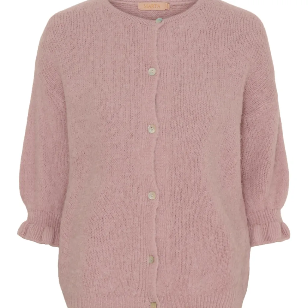 Sød strikket cardigan fra Marta med flæsedetaljer ved ærme. Cardiganen har fine knapper langs fronten og er med 3/4 ærmer. Helt perfekt til hverdagsbrug. Style den med både jeans, habitbukser og nederdele – mulighederne er mange.