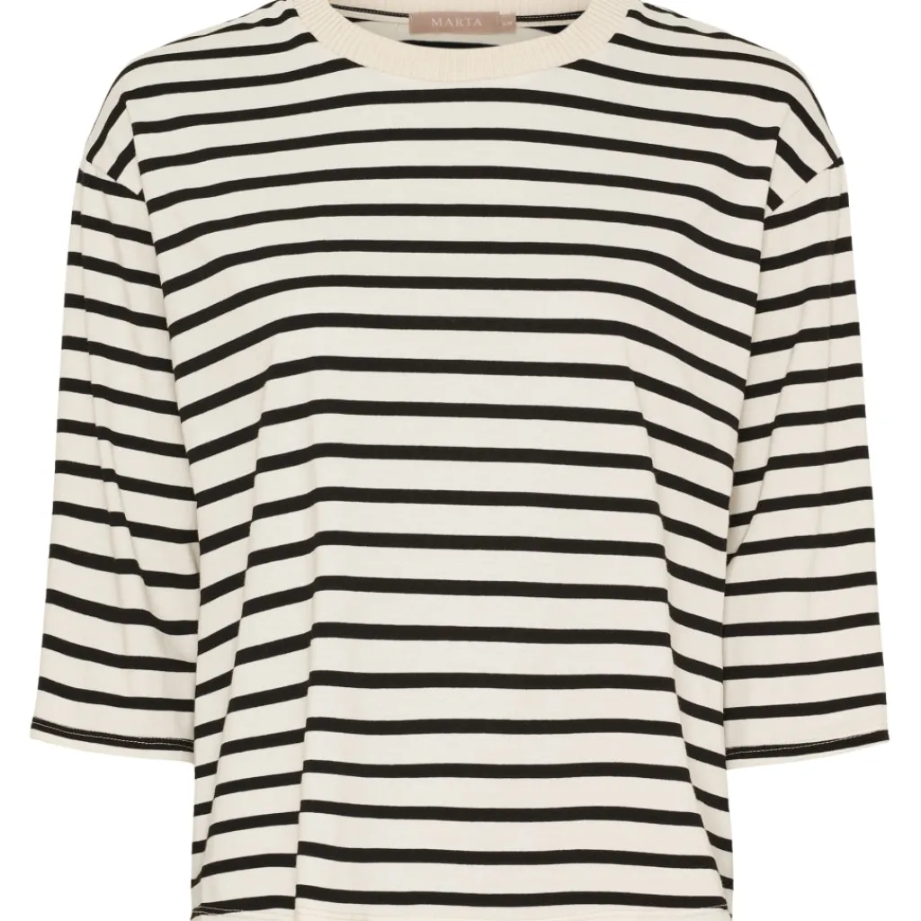 Basic og komfortabel stribet t-shirt fra Marta Du Château. Den har rund hals med ribkant og 3/4 lange ærmer. Ideel til hverdag med et par enten jeans, bukser eller nederdel.