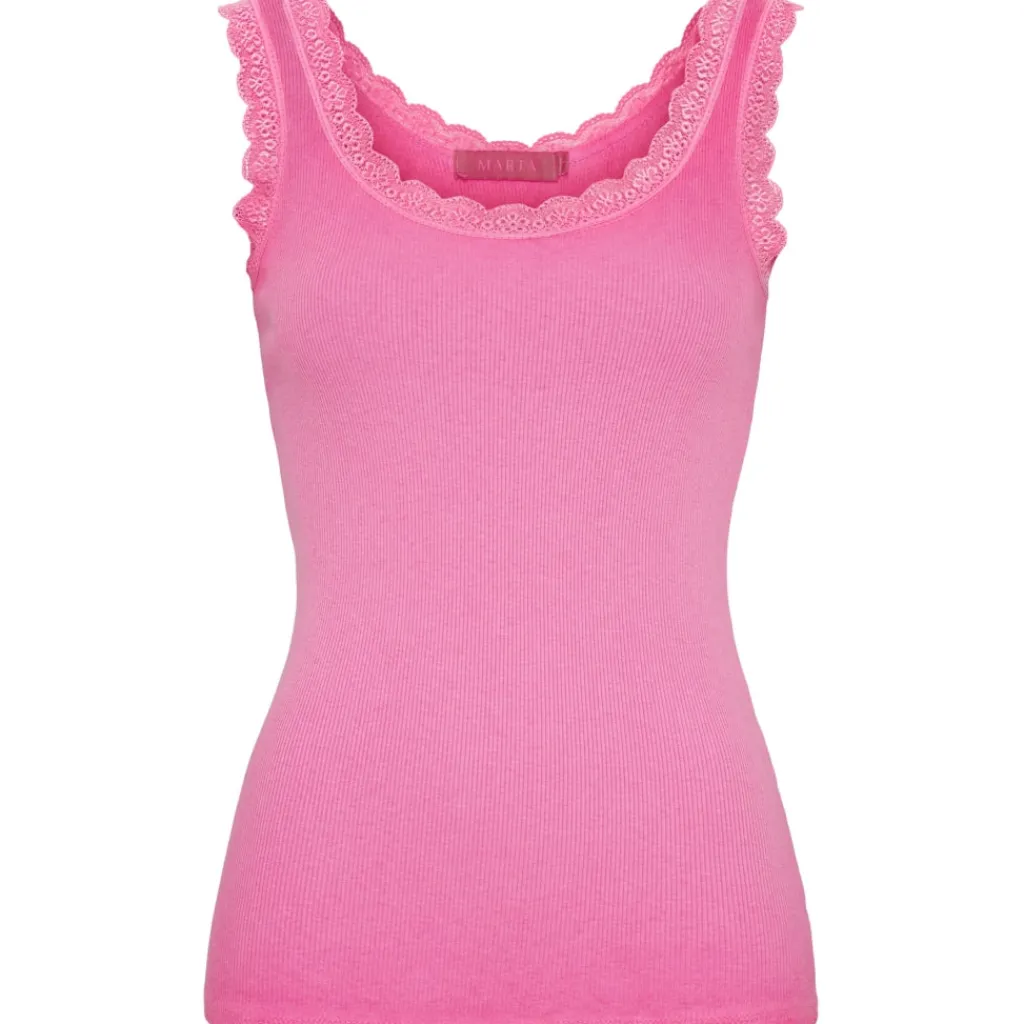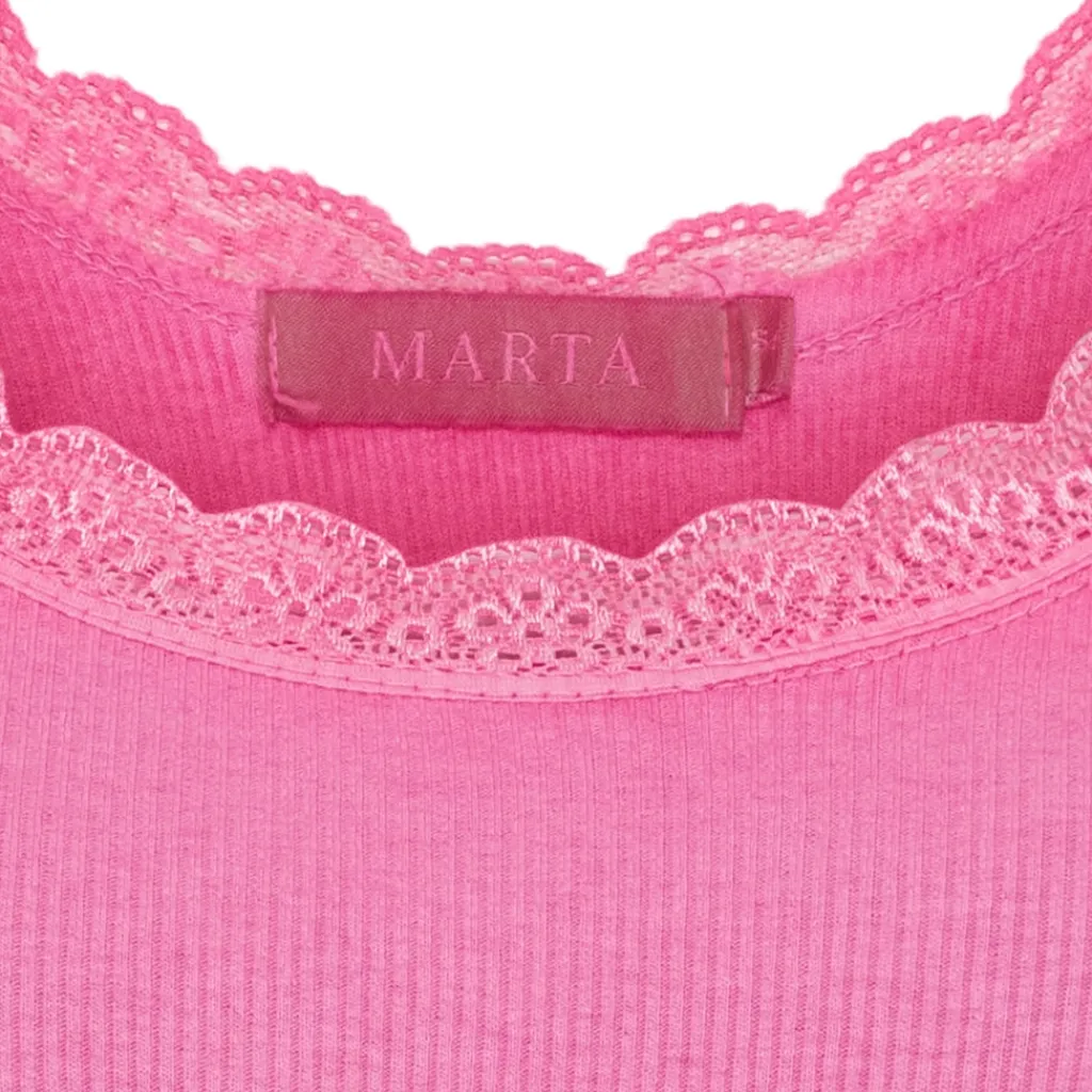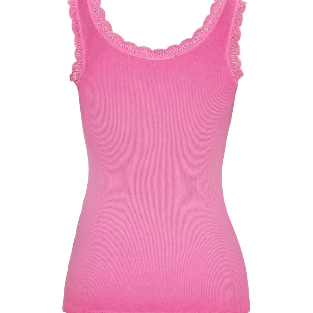 Feminin tanktop med fine blondedetaljer langs halsudskæringen og ærmegaberne. Fungerer som basislag eller til at style alene på varme dage.