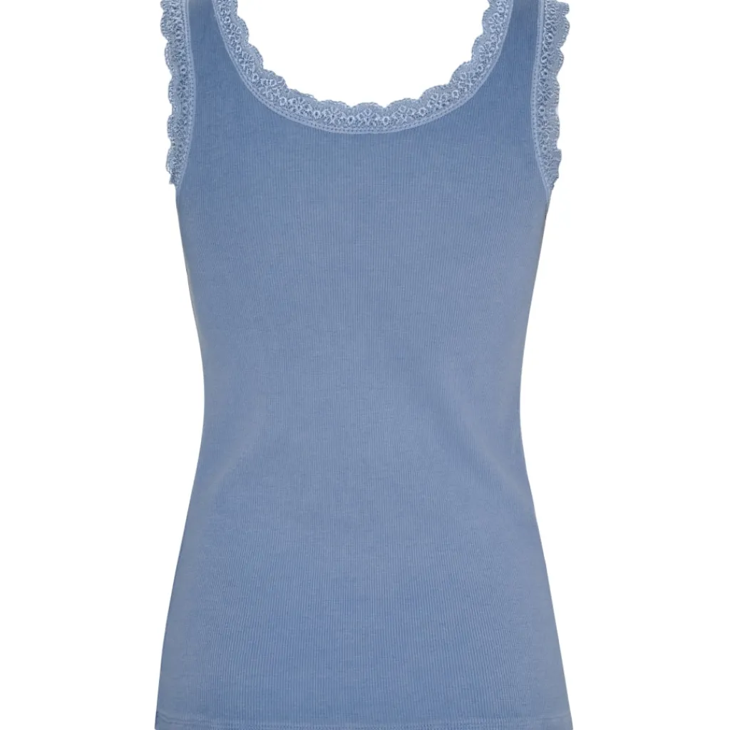 Feminin tanktop med fine blondedetaljer langs halsudskæringen og ærmegaberne. Fungerer som basislag eller til at style alene på varme dage.