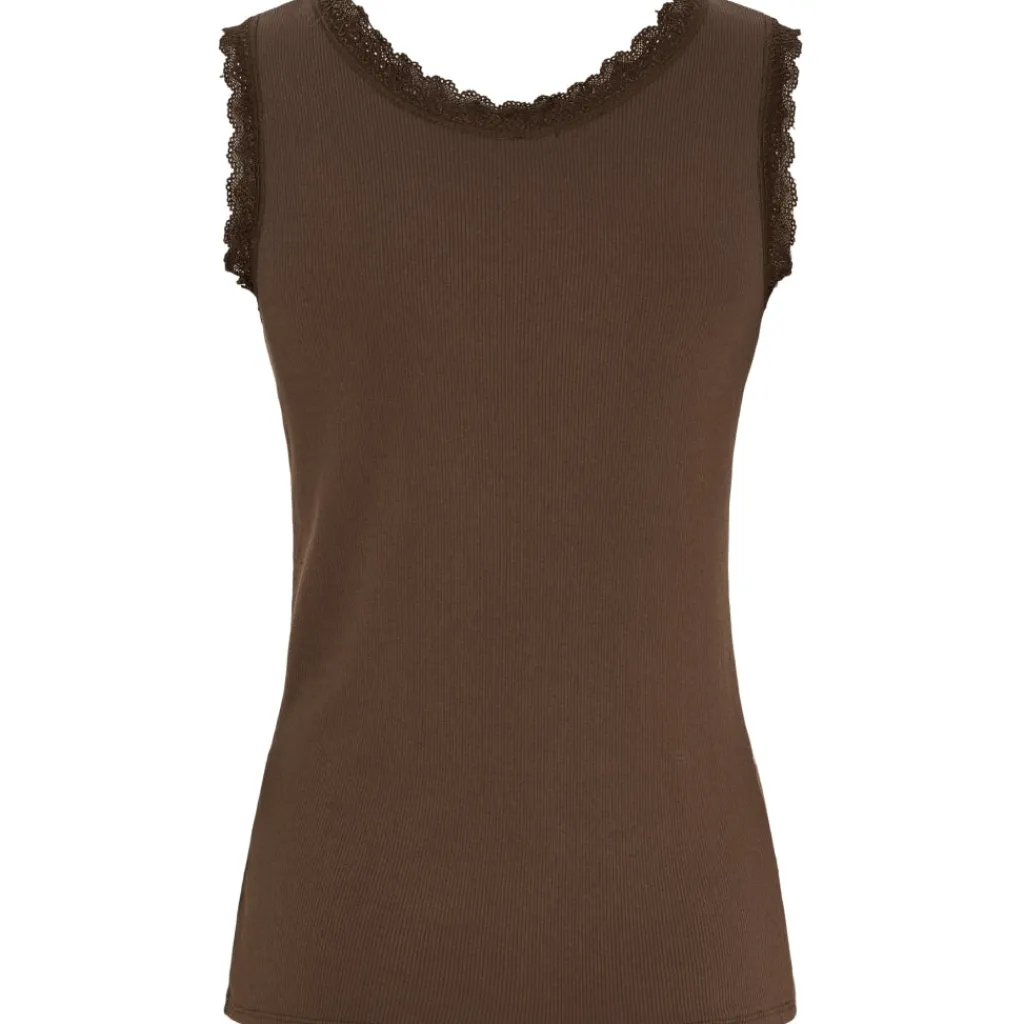 Feminin tanktop med fine blondedetaljer langs halsudskæringen og ærmegaberne. Fungerer som basislag eller til at style alene på varme dage.