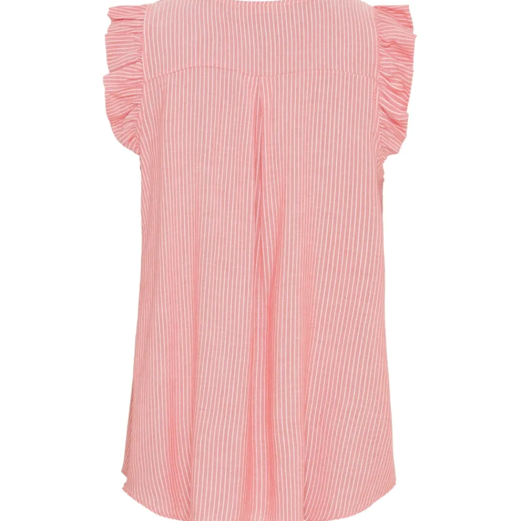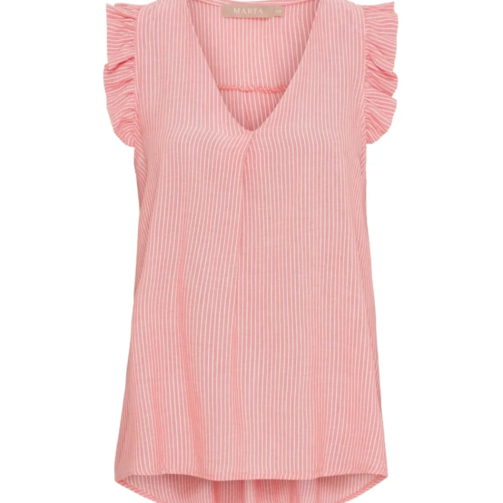 Sød stribet top fra Marta du Château med lurex tråd. Toppen har V-udskæring og flæse ved ærme. Perfekt til både hverdag og finere brug – nem at style med både shorts, nederdele og bukser.