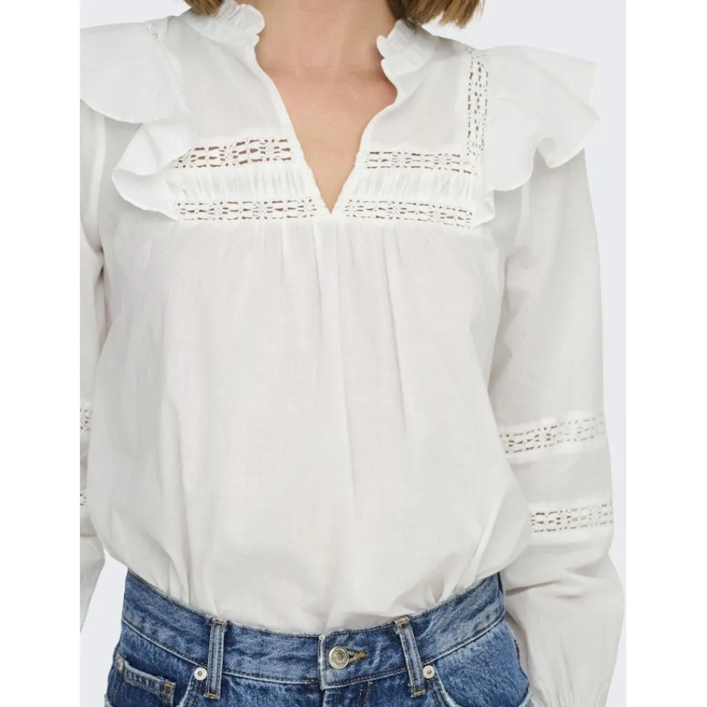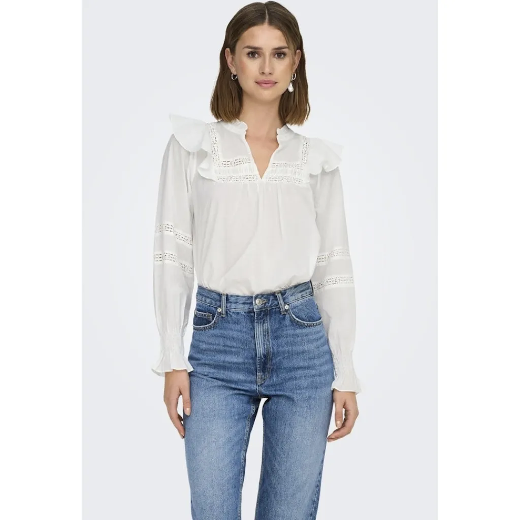 Fin blondebluse fra Only med flæsedetaljer, der skaber et romantisk udtryk. Normal i størrelsen.
