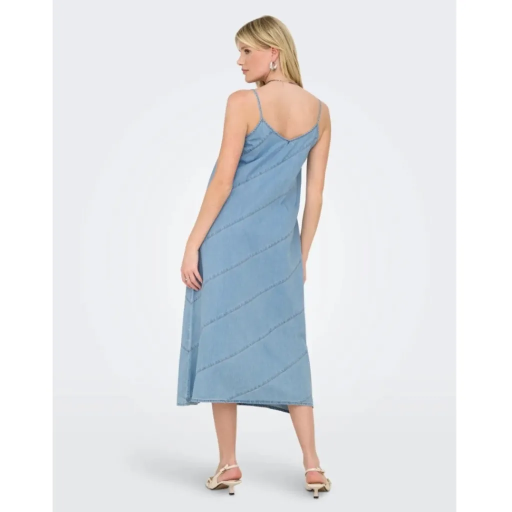 Smuk kjole fra Only i denimlook. Style til hverdagen med et par sandaler og basis cardigan. Eller style med et par stiletter og blazer til sommerens fester.