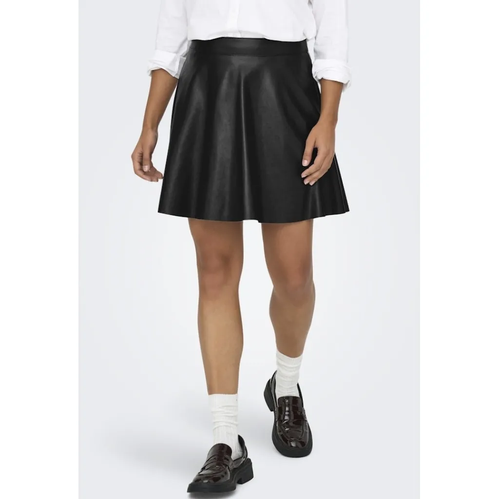 Cool og enkel mini nederdel fra ONLY i imiteret læder. Den har lynlås bagpå. Nederdelen kan styles med en strik og et par støvler for et perfekt og stilfuldt look her til efteråret.