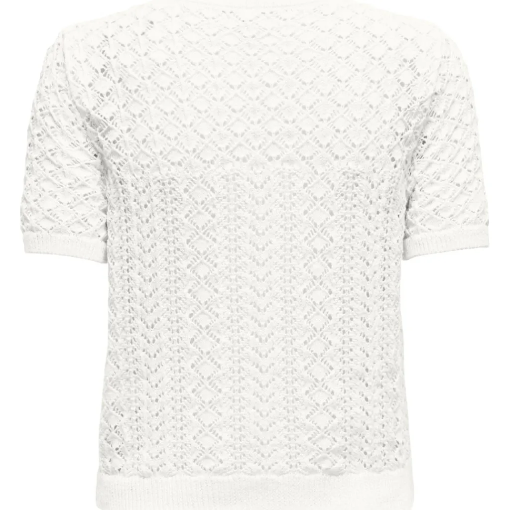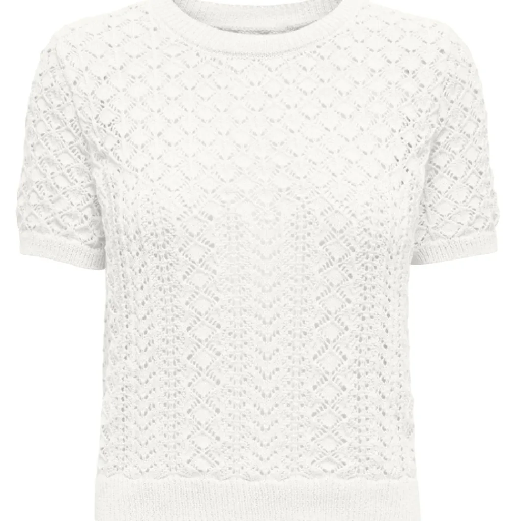 Smuk strik t-shirt fra Only med hulmønster, der gør at den et let gennemsigtig. Style den derfor evt. med en basis top under. Den er super fin og feminin, og kan både bruges til jeans og nederdele.