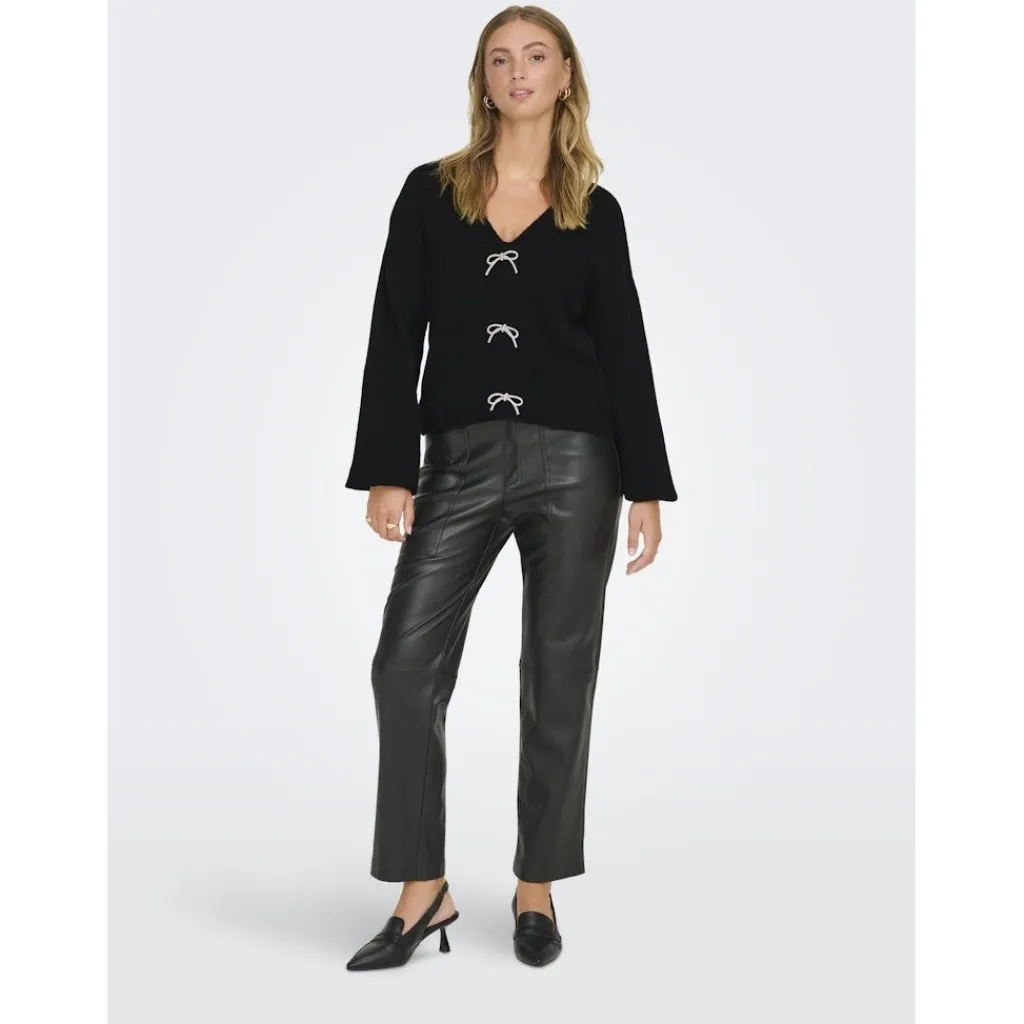 Smuk og feminin cardigan fra ONLY med sløjfe detaljer. Cardiganen har V-hals og vidde ærmer med elastikkant. Helt perfekt til enhver lejlighed og sæson.