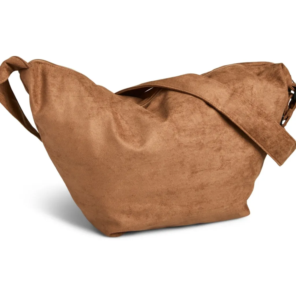 Sejeste suede taske fra Pieces med god rummelighed. Tasken har en justerbar rem, indvendig lomme med lynlås og to åbne lommer indvendig, samt lynlås-lukning.