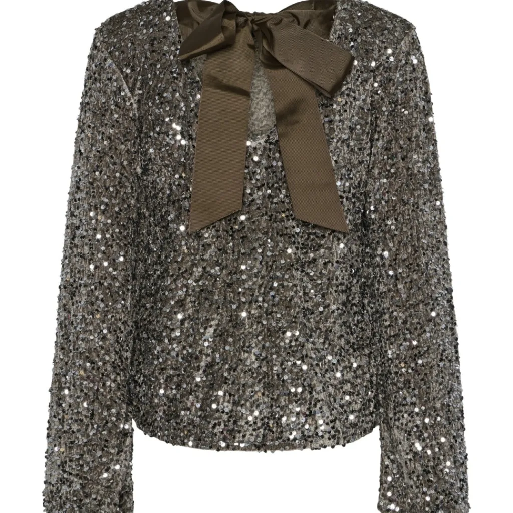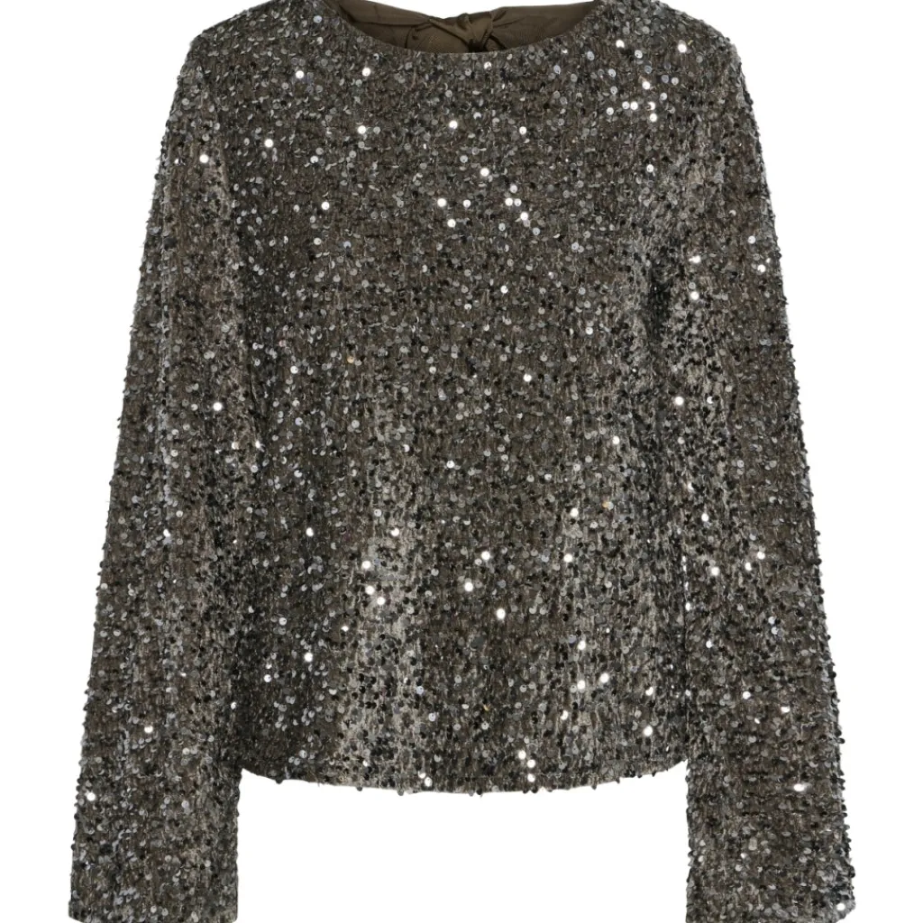 Smuk glimmerbluse fra Pieces med bindebånd på ryggen. Blusen kan styles med bukserne fra samme serie, for det ultimative glimmerlook.