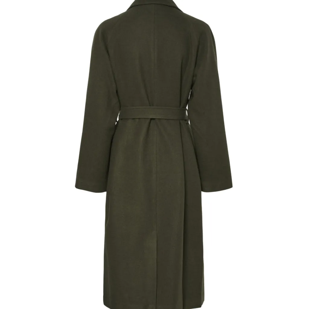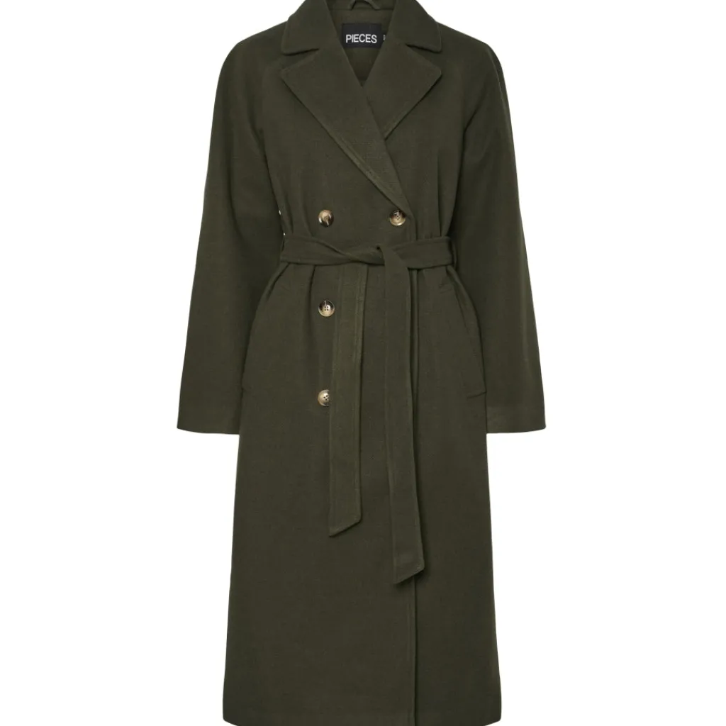 Lang frakke med dobbeltknappet lukning og bælte, som holder dig varm i den kolde tid. Denne frakke har omvendt halsudskæring og sidelommer.