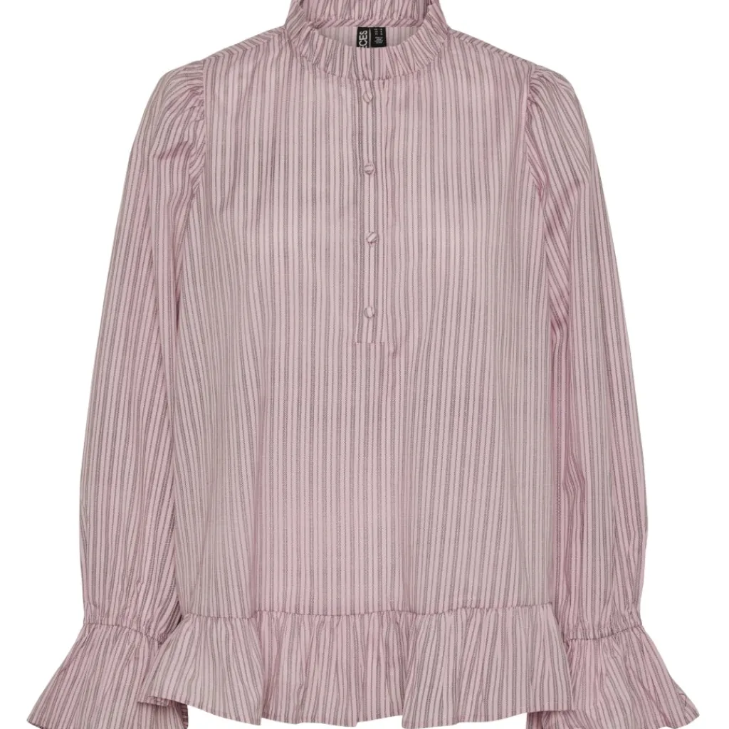 Smuk bluse med flæsedetaljer fra Pieces. Blusen har fine knapper og er højhalset, og er helt normal i størrelsen.