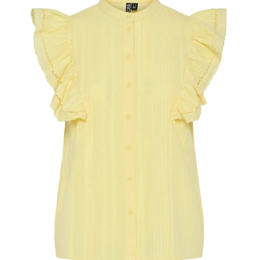 Fin og feminin top med smukke flæsedetaljer fra Pieces. Toppen har sofistikerede knapper og går en smule op i halsen. Ideel her til foråret og sommeren med en fin nederdel eller shorts til.