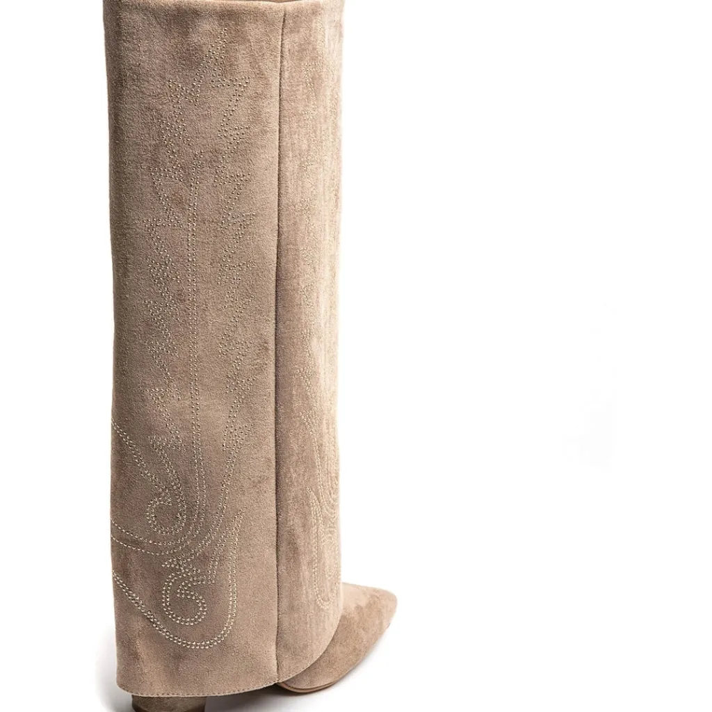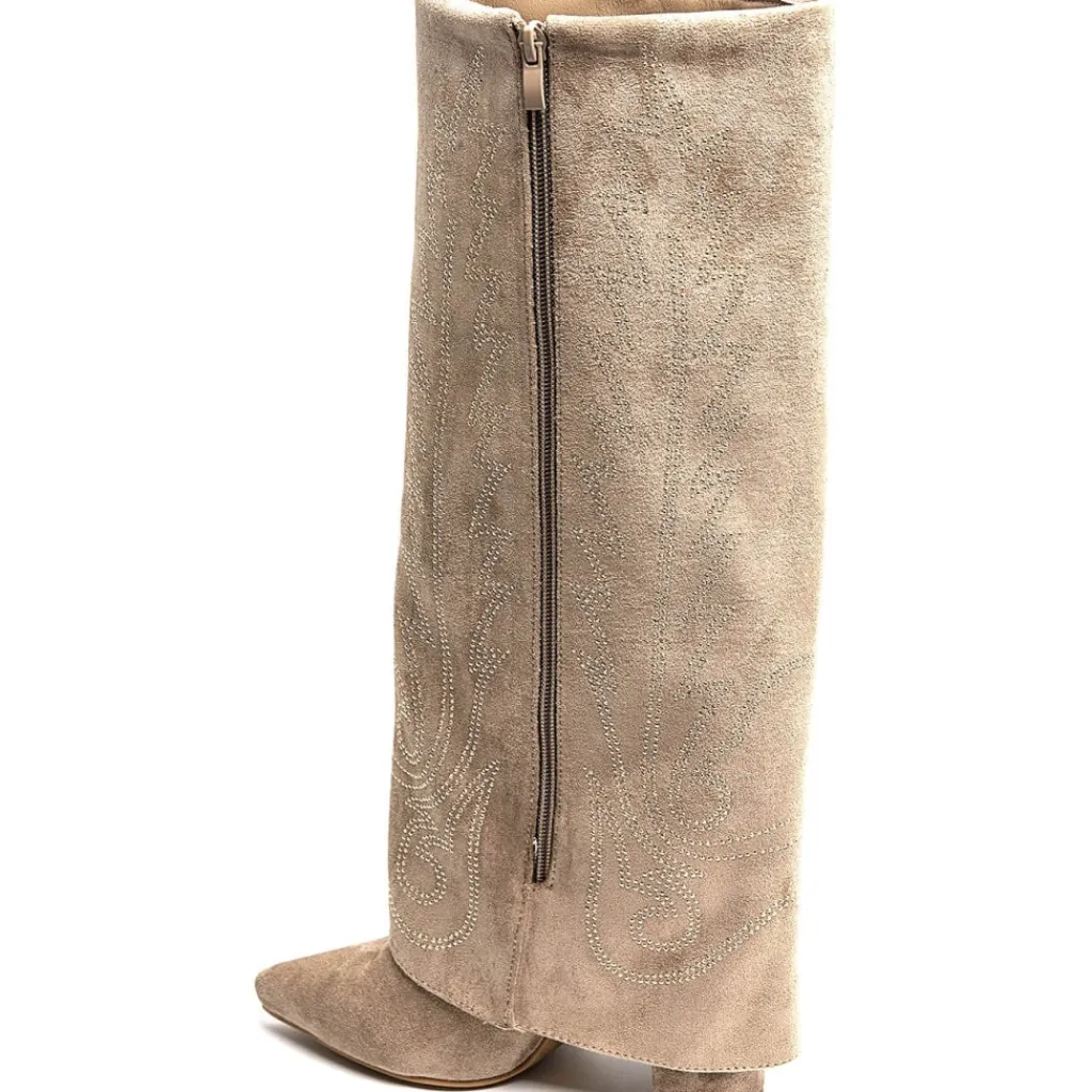 Højhælet støvle med fine sten detaljer på ydersiden og lynlås på indersiden.