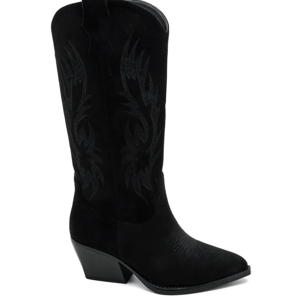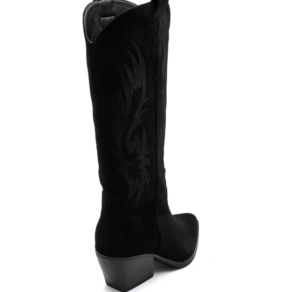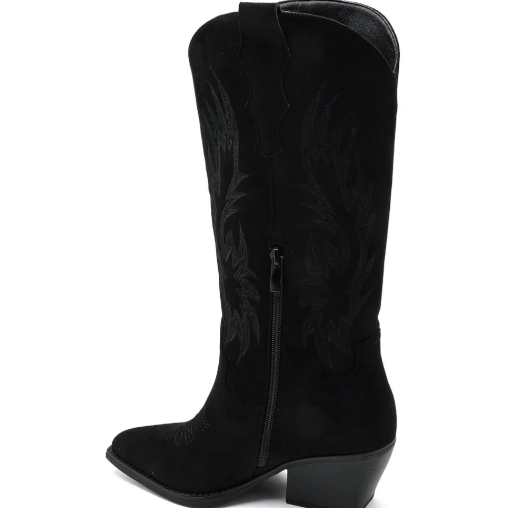 Super sej imiteret ruskinds cowboystøvle med de fedeste detaljer. Støvlerne har en høj skaft, blokhæl og lynlås på indersiden. De kan styles til enhver lejlighed – brug den med en kjole og strømpebukser eller til et par jeans og blazer.