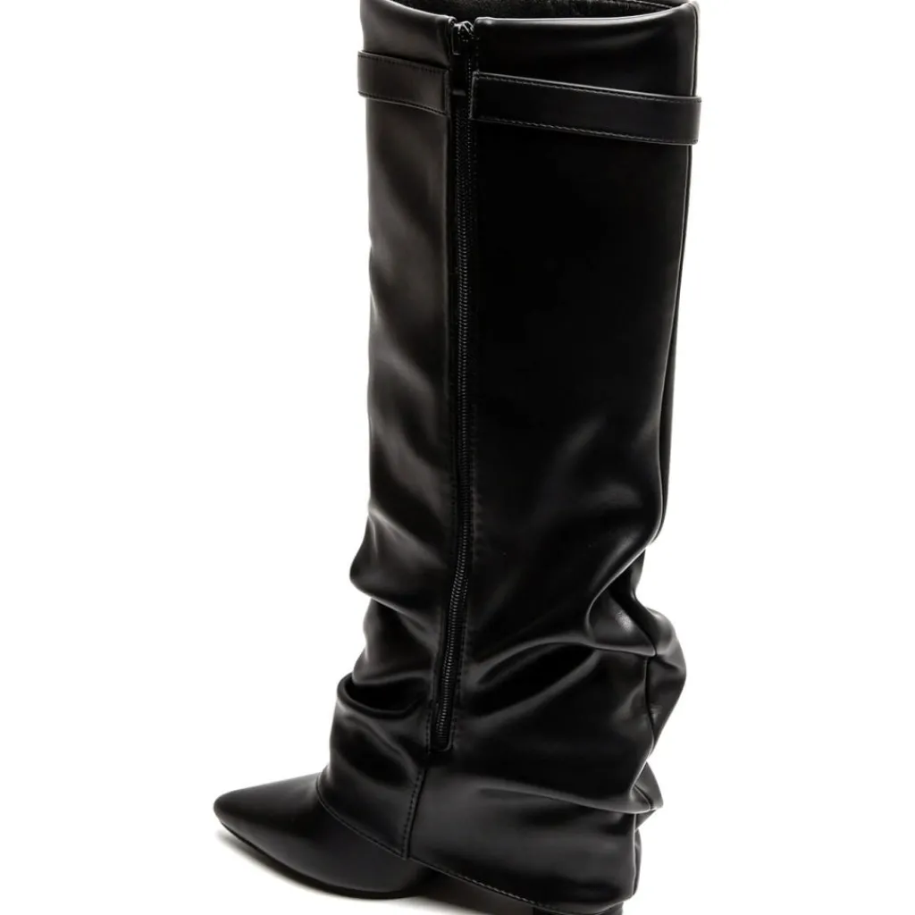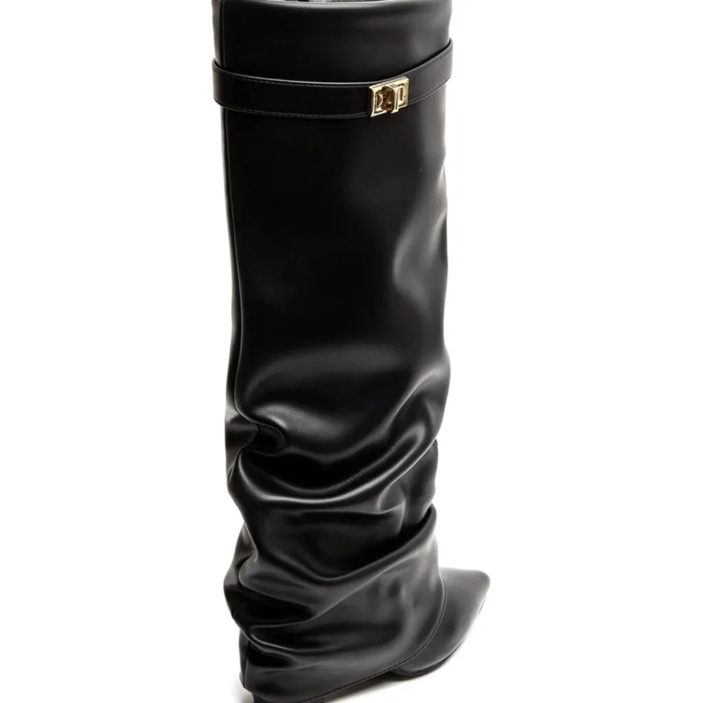 Cool højskaftet støvle med spids snude i imiteret skind, perfekt til både hverdag og fest.