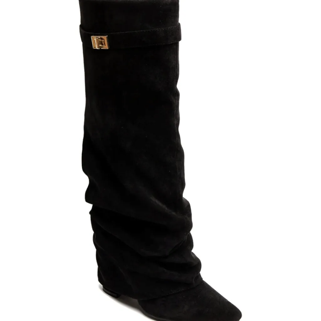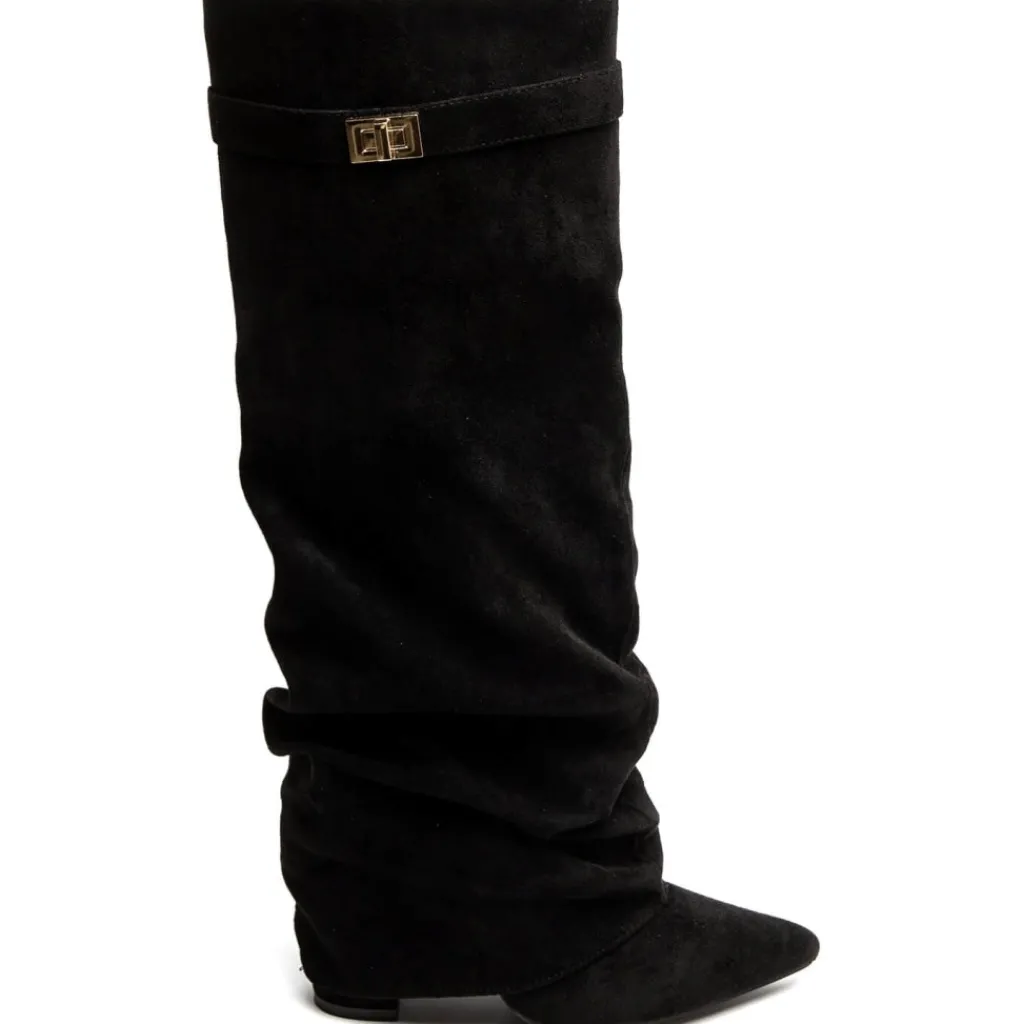 Cool højskaftet støvle med spids snude i imiteret ruskind, perfekt til både hverdag og fest.
