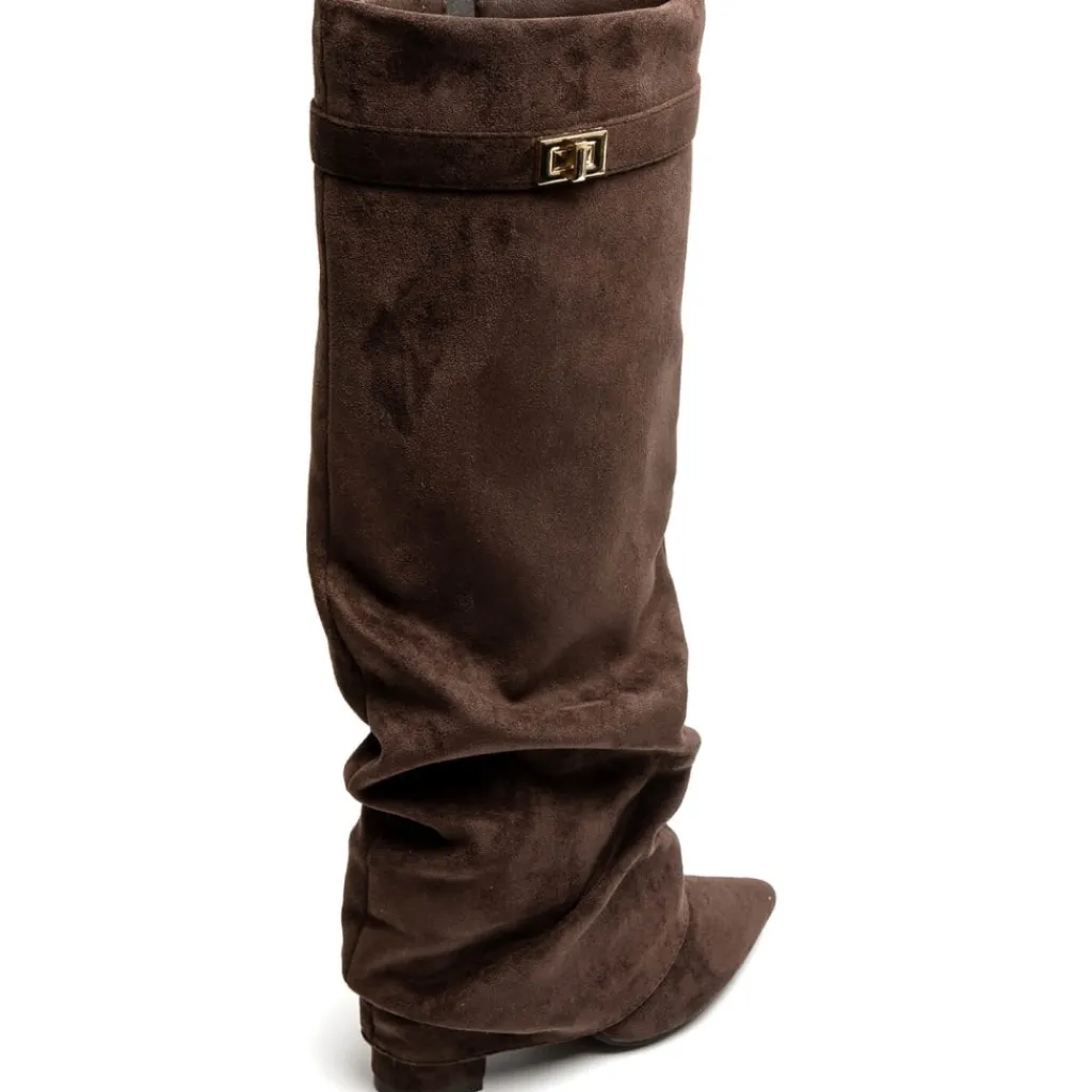 Cool højskaftet støvle med spids snude i imiteret ruskind, perfekt til både hverdag og fest.