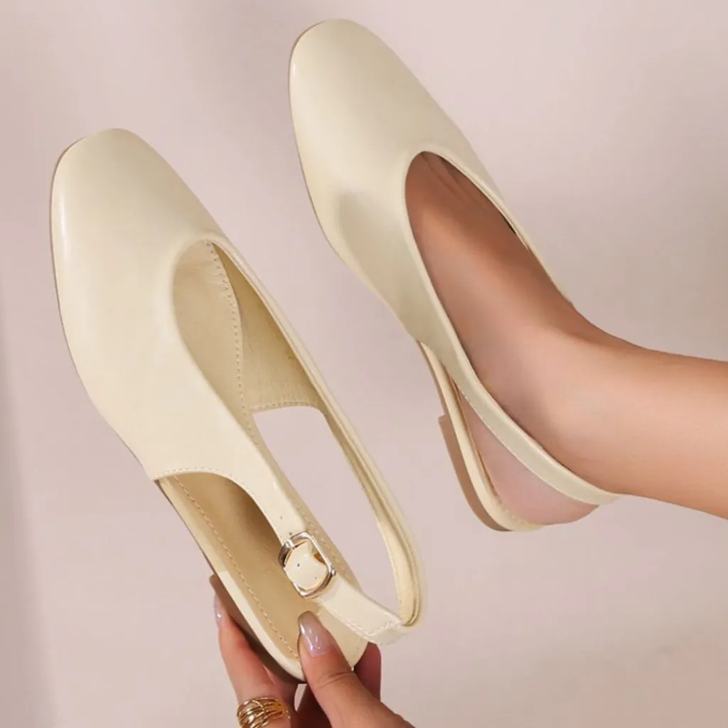 Super fin ballerina med åben hæl. Den har en justerbar rem med guld spænde. Ballerinaen er helt perfekt til både hverdag og finere brug.