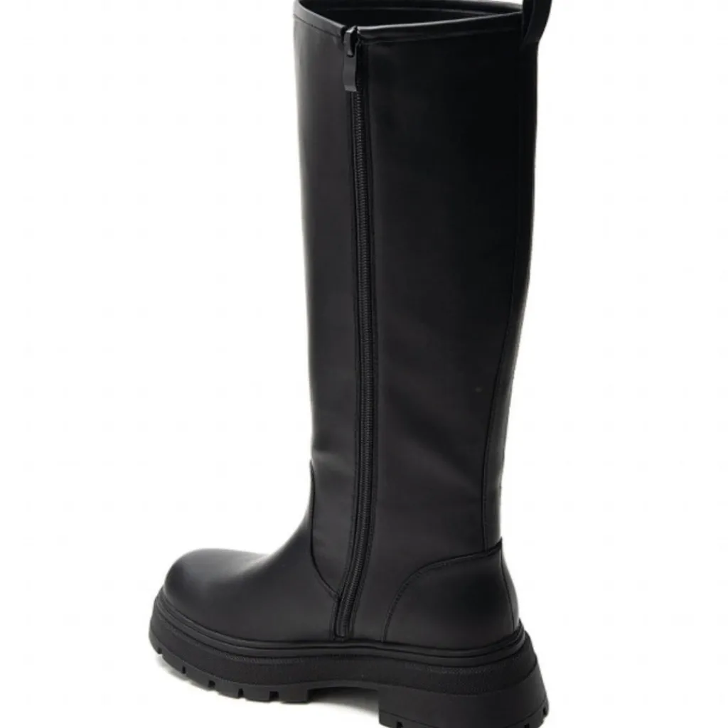 Super sej knæhøj støvler med en chunky sål. Støvlerne har en lynlås på indersiden og spænde detalje på ydersiden.