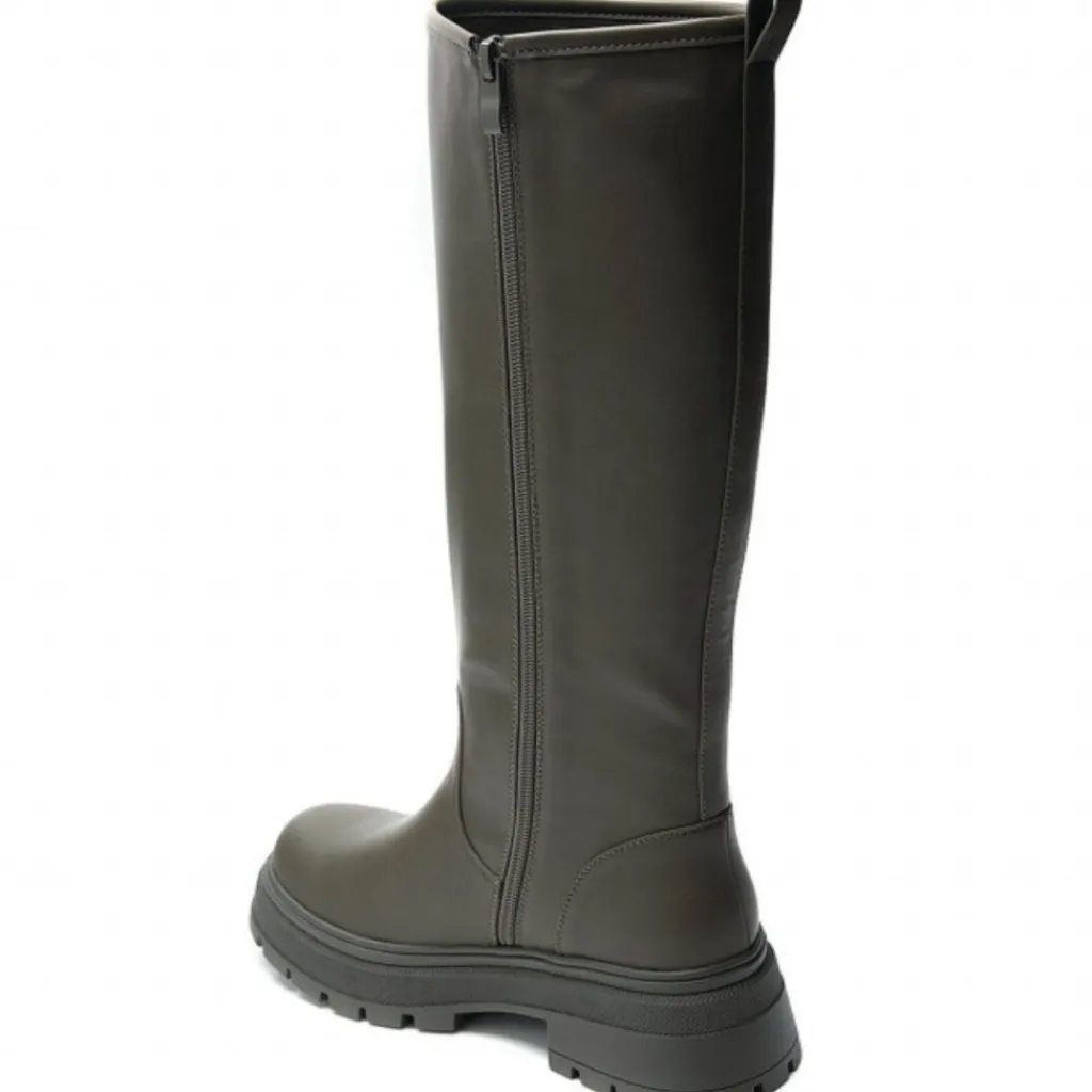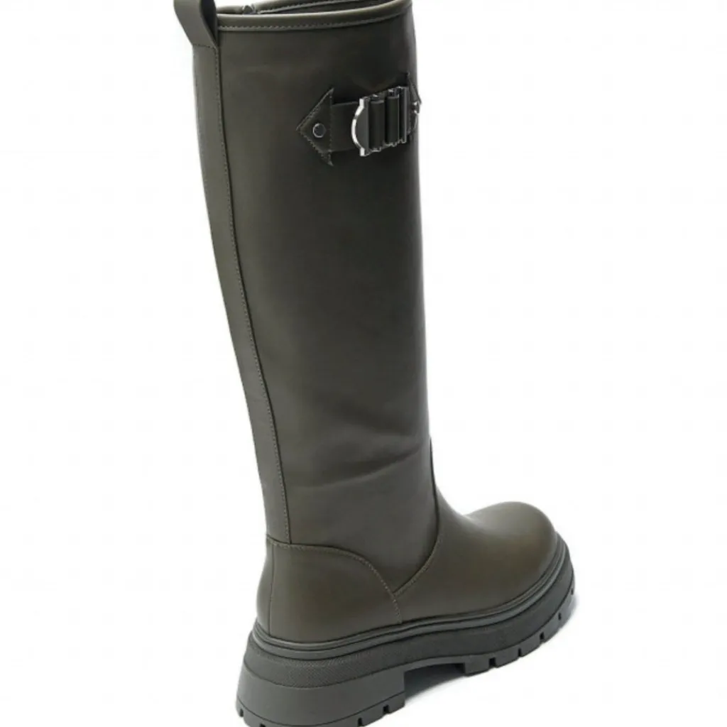 Super sej knæhøj støvler med en chunky sål. Støvlerne har en lynlås på indersiden og spænde detalje på ydersiden.