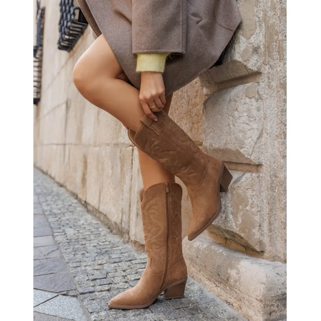 Super sej imiteret ruskinds cowboystøvle med de fedeste detaljer. Støvlerne har en høj skaft, blokhæl og lynlås på indersiden. De kan styles til enhver lejlighed – brug den med en kjole og strømpebukser eller til et par jeans og blazer.