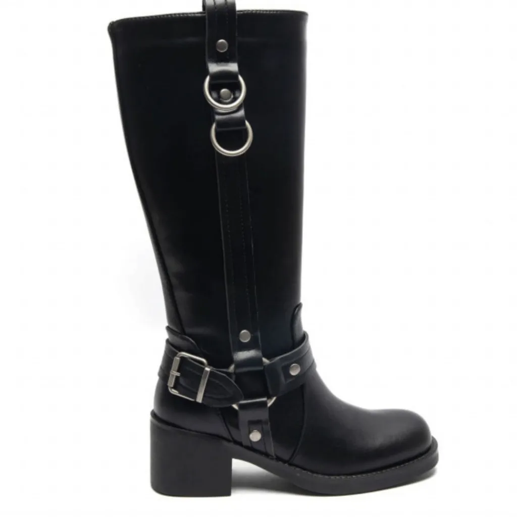 Sej bikerstøvle med cool detaljer. Støvlerne har en høj skaft, blokhæl og rå biker detaljer. Støvlerne har en god pasform og den solide hæl, gør at støvlerne behagelig at have på hele dagen.
