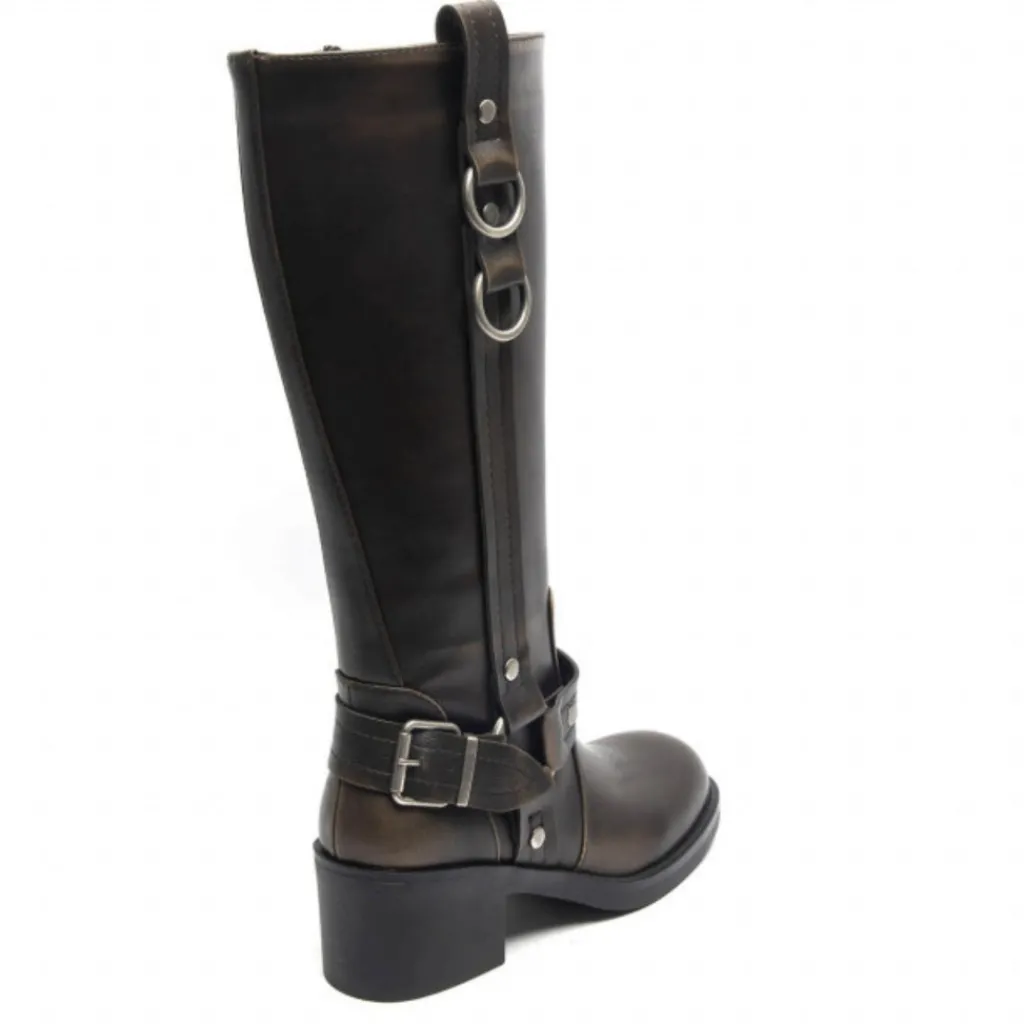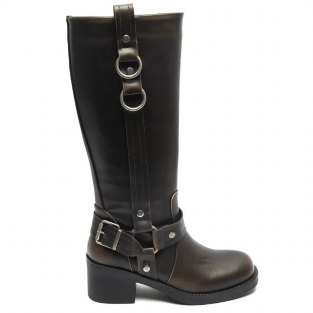 Sej bikerstøvle med cool detaljer. Støvlerne har en høj skaft, blokhæl og rå biker detaljer. Støvlerne har en god pasform og den solide hæl, gør at støvlerne behagelig at have på hele dagen.