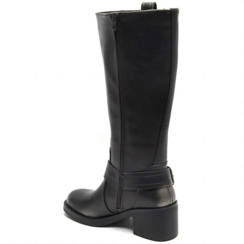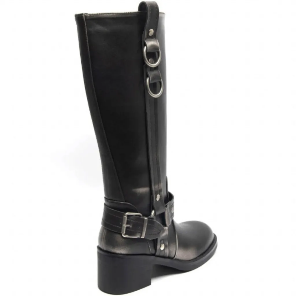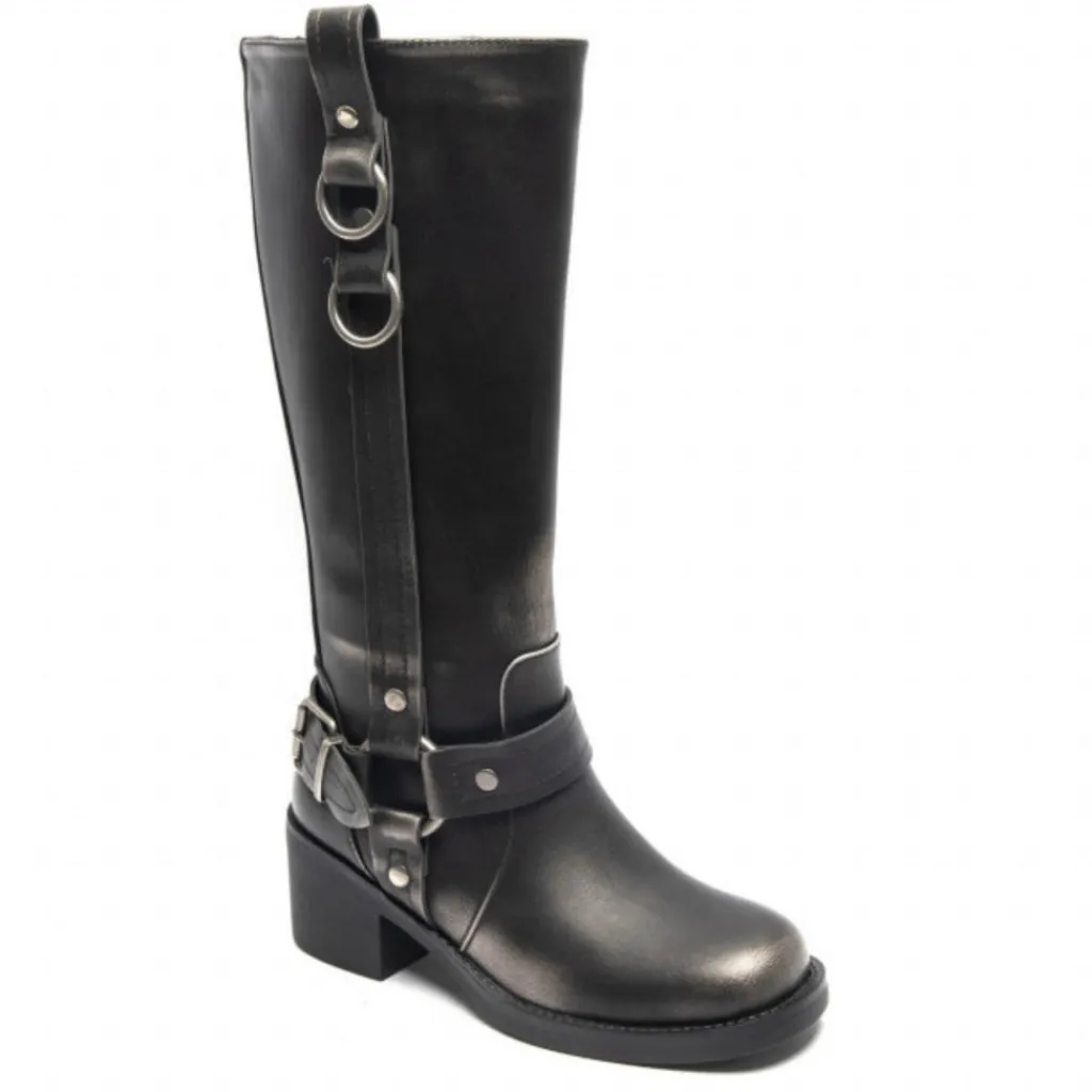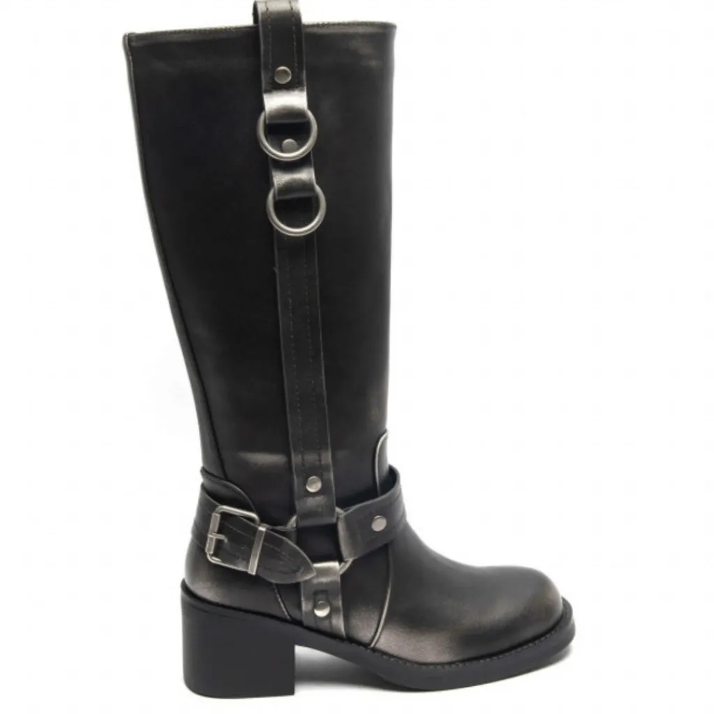 Sej bikerstøvle med cool detaljer. Støvlerne har en høj skaft, blokhæl og rå biker detaljer. Støvlerne har en god pasform og den solide hæl, gør at støvlerne behagelig at have på hele dagen.