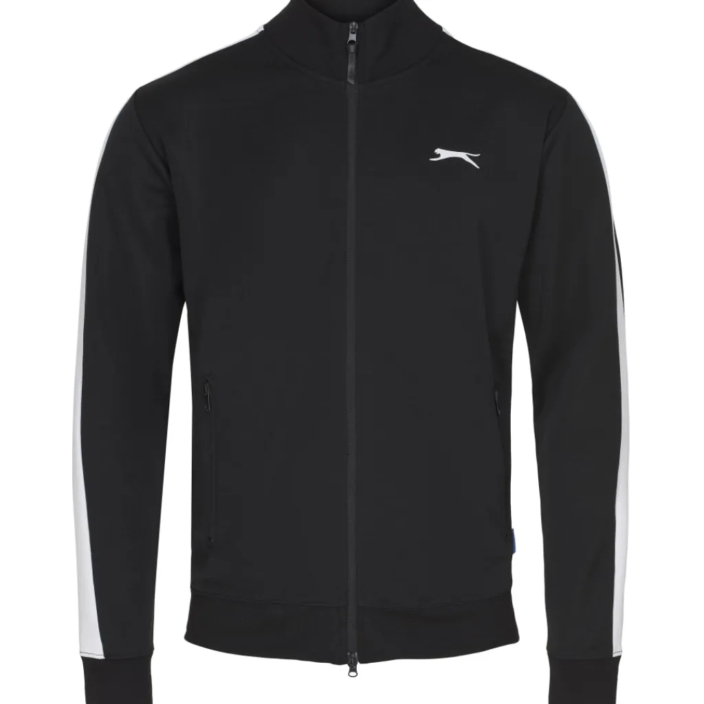 Trøjen har striber ned langs ærmerne og to lommer med lynlås foran. Den åbnes/lukkes med lynlås.